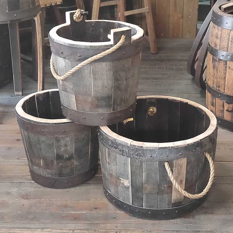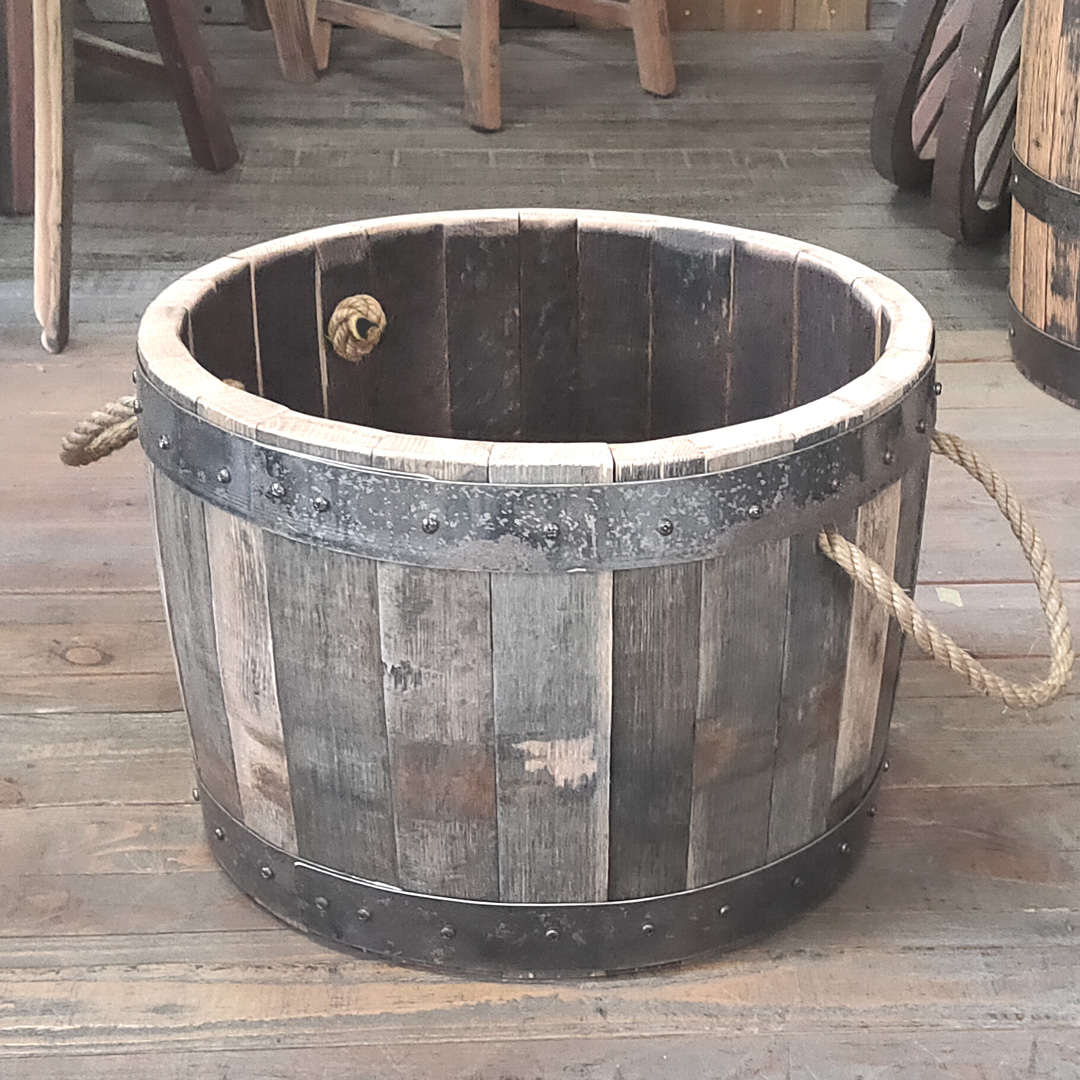樽好きにはたまらない風合いをそのままのに残し、磨き上げサイズに合わせ熟練の職人が作り上げたウイスキー樽材使用のワイドバケット持ち手付きです。