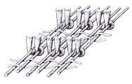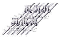 オリエント絨毯の織り(手結び)はペルシャ結びとトルコ結びのふたつに大別できます。1本の経糸のまわりを1本のパイル糸でS字型に結ぶのがペルシャ結び。別名セーナ(Sehna)結びと呼ばれ、イランおよびイラン以東、中国、インドなどで多く用いられています。また、2本の経糸のまわりを1本のパイル糸で結ぶのがトルコ結び。別名ギョルデース(Ghiordes)結びと呼ばれ、トルコ、コーカサス、イランの西部などで使用されています。それぞれの結びは、結び目が多いほど、織密度が濃くなり、高級なものとされています。