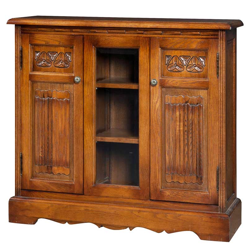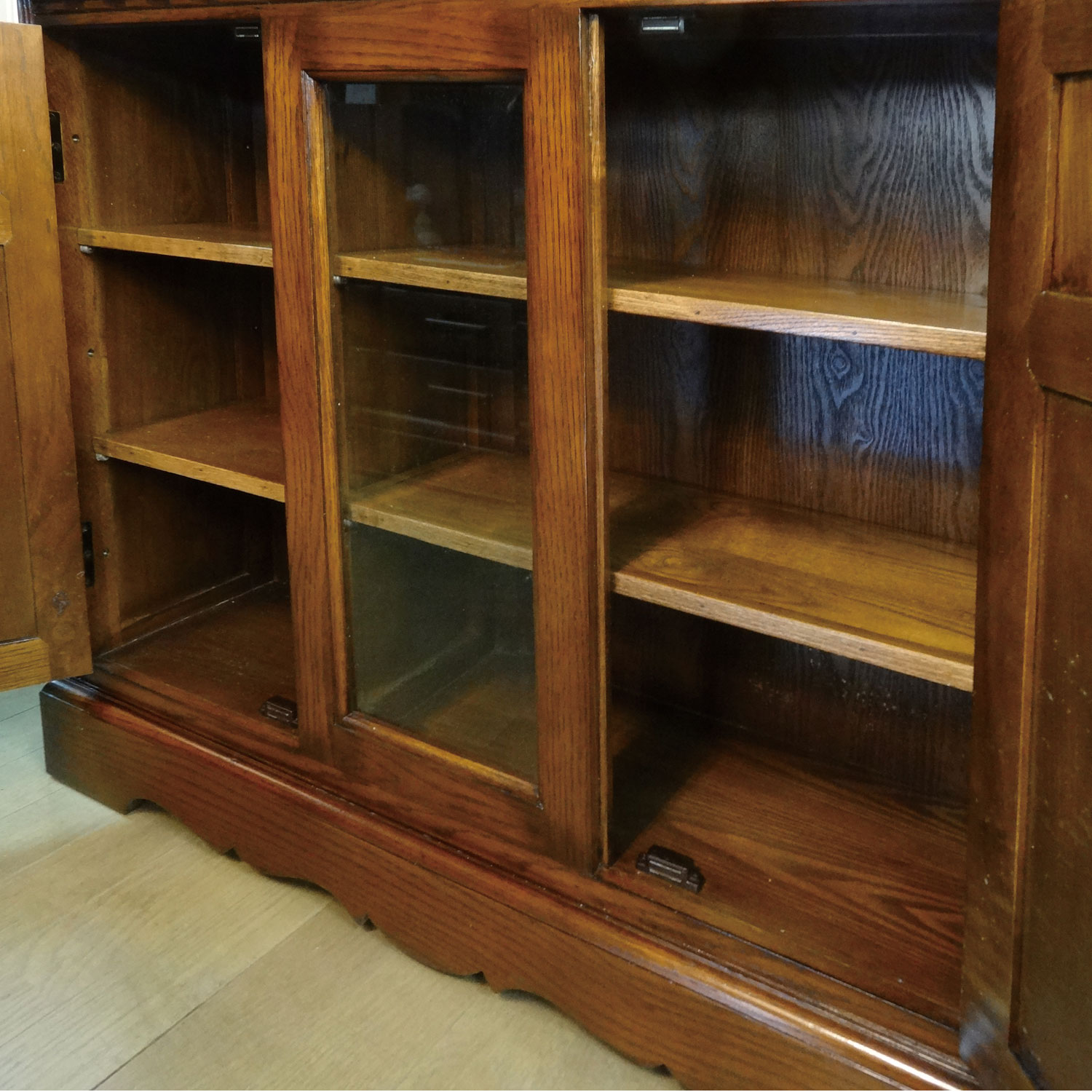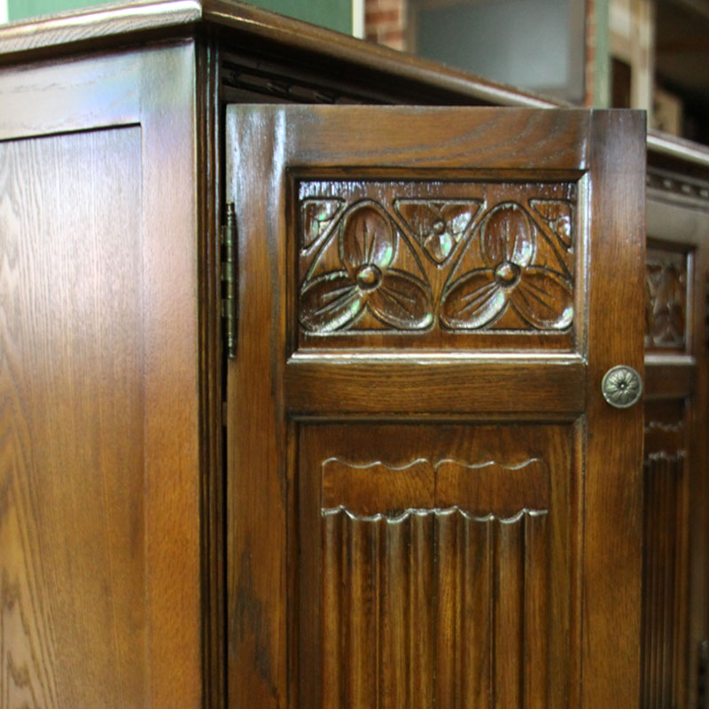 扉に手彫りの彫刻が入り、とてもシックな、それでいて存在感のあるキャビネット(サイドボード)です。奥行きもないので、場所もとりません。