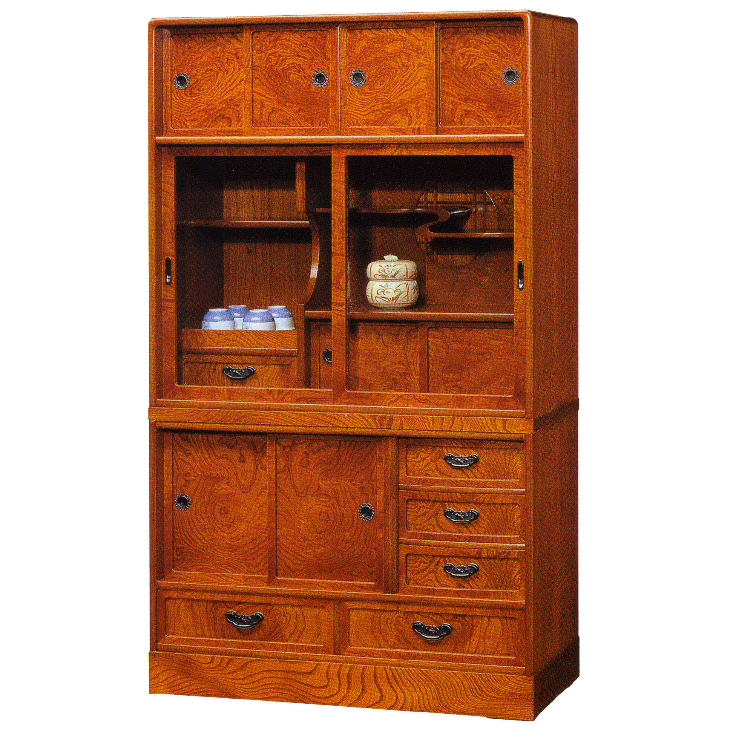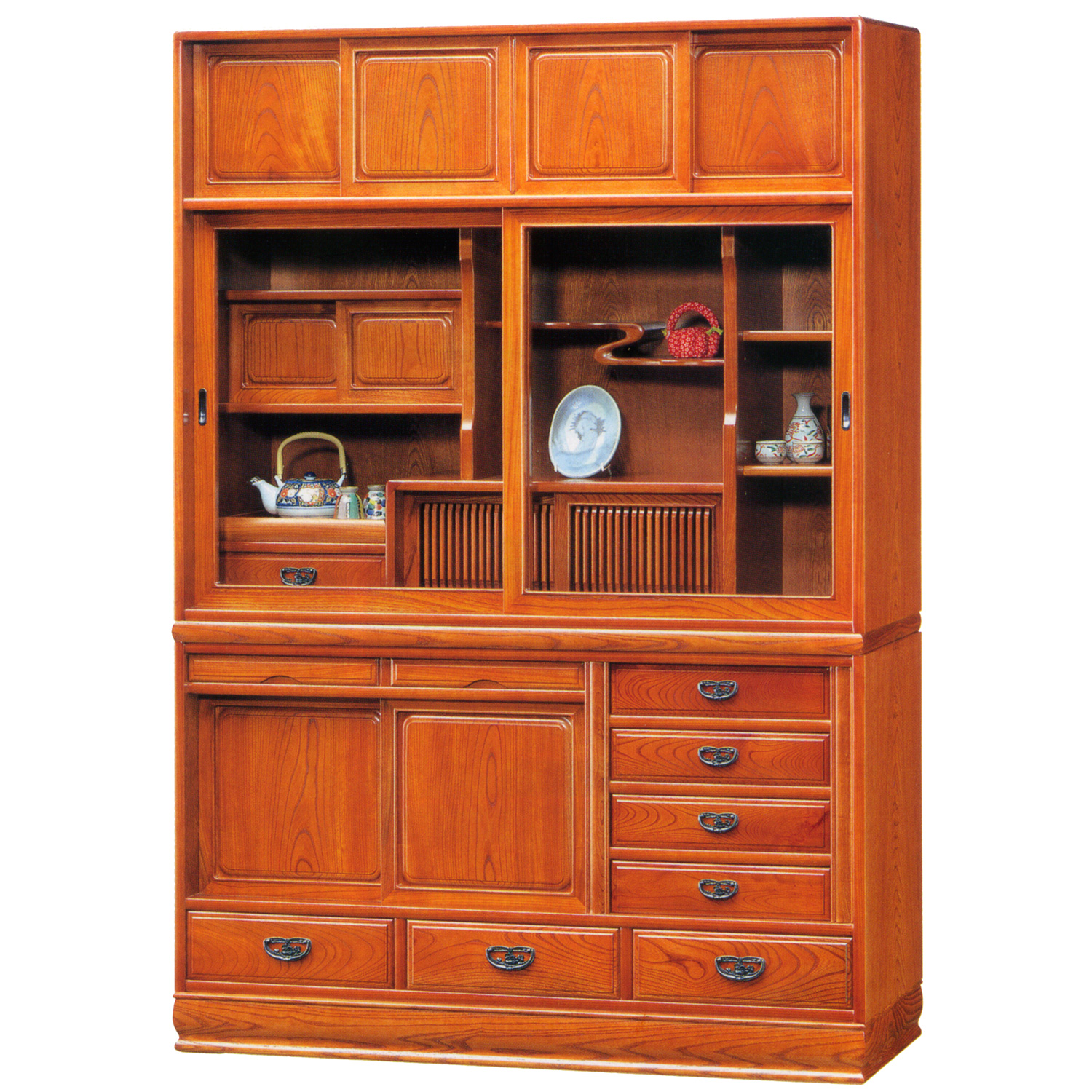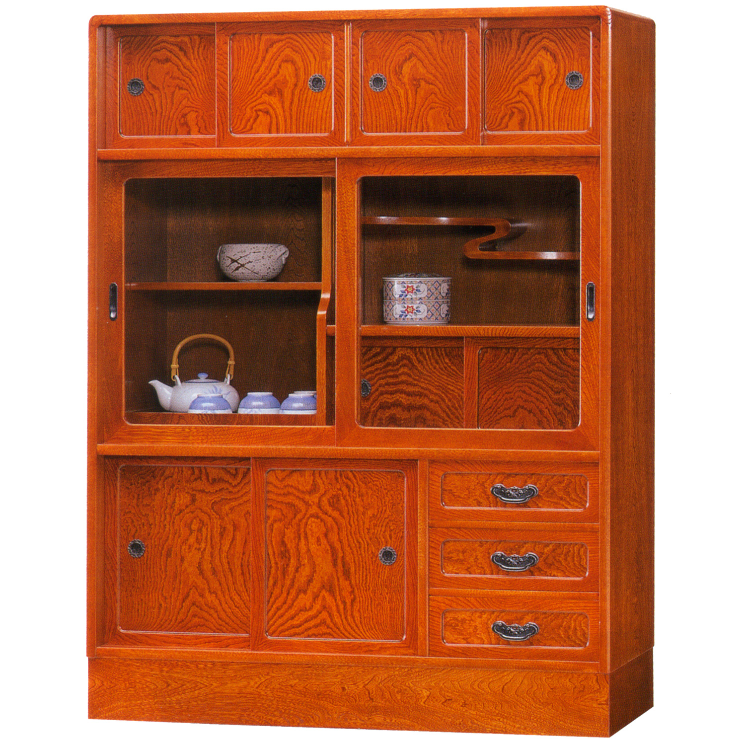 日本の伝統的な和茶棚。ケヤキ材の綺麗な木目を生かし、匠の技が、光る逸品です。こちらの和茶棚は、前面にケヤキの無垢材を使用した高級仕様となっております。