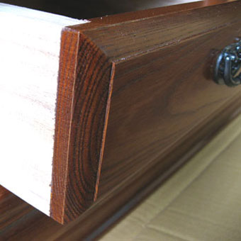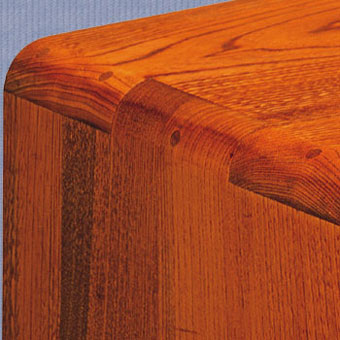 天板と側面が無垢材(単板)のため、ホゾが作れ、組み合わせた接合ができます。より頑丈な造りとなります。無垢材(単板)使用だからできる伝統的な技です。