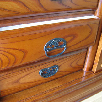 引出し前板もケヤキの無垢材なので、板の切断面にも年輪が確認できます。国内で家具用材といて価値の高いケヤキの無垢板を前板に使用しています。