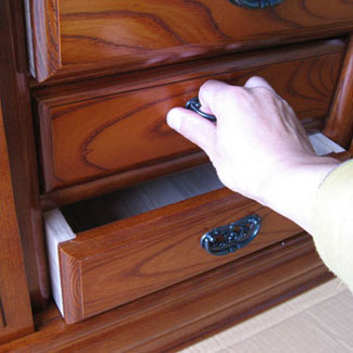 引出しの引き込みの良さは、引出を逆さまに入れてもピタリとおさまることからも確認できると思います。