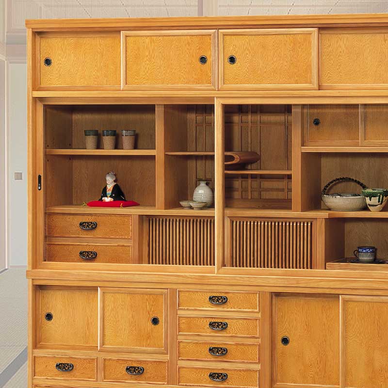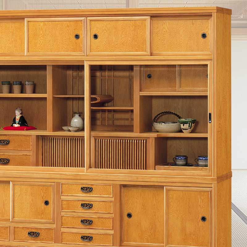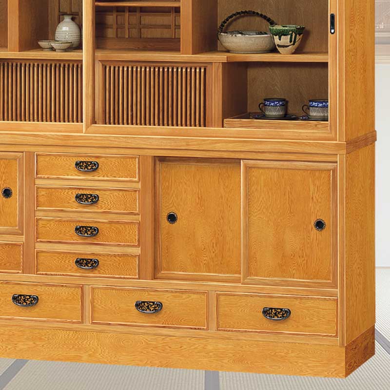 日本の伝統的な和茶棚。貴重な屋久杉材の綺麗な木目を生かし、匠の技が、光る逸品です。こちらの和茶棚霧島56は、屋久杉材の天然杢を使用した貴重な品、ワイドで贅沢な逸品です。屋久杉の幾重にもなった木目の美しさは、和室の癒しの空間を演出してくれることでしょう。