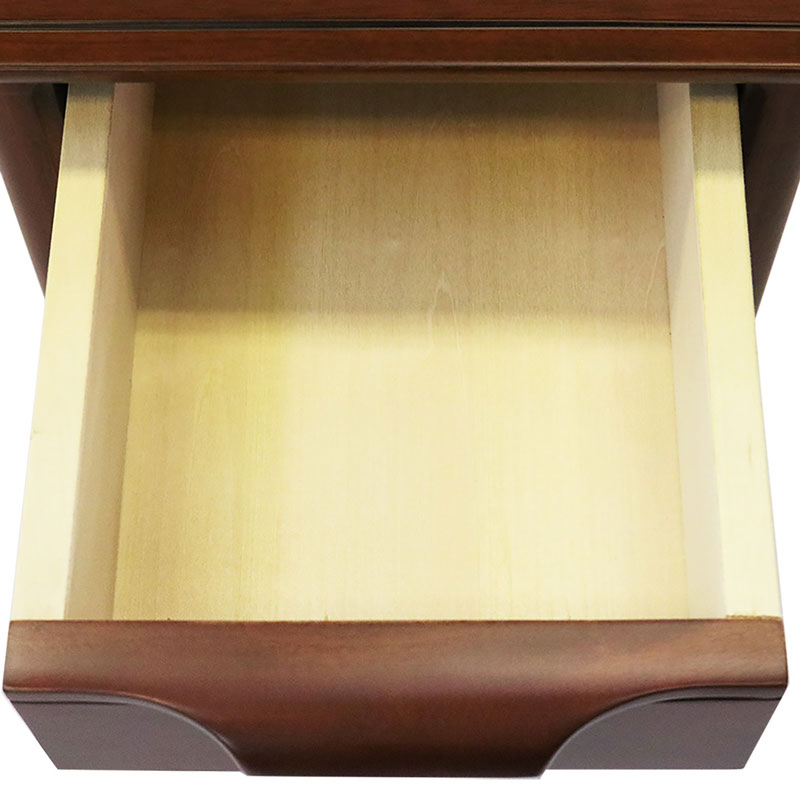温もりを感じるシンプルなボディーに、マホガニー無垢材を削り出した手触りの良い取っ手と、すっきりと伸びたテーバードレッグが特徴です。