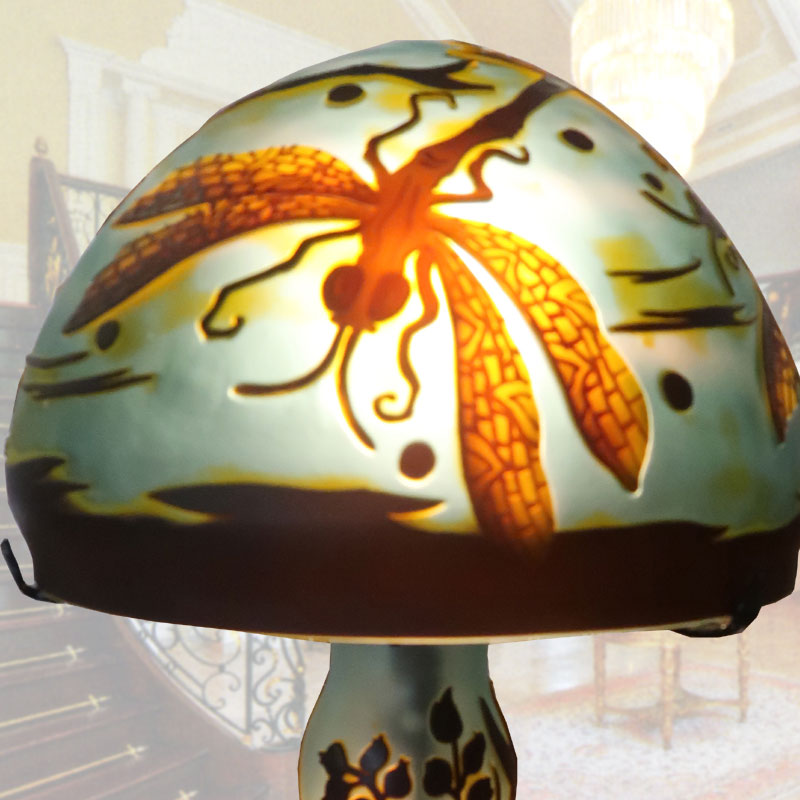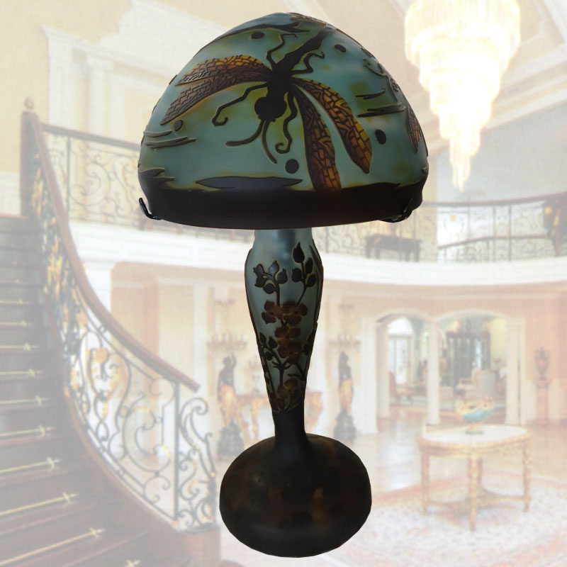 マーブルの背景に蜻蛉柄のガレ風ランプです。色合いがとっても綺麗!そして存在感のある逸品です。