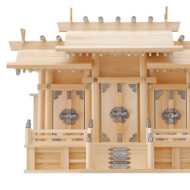 岐阜県産東濃ひのきを使用し作られた屋根違い三社(金具:シルバー)タイプの高級神棚。
