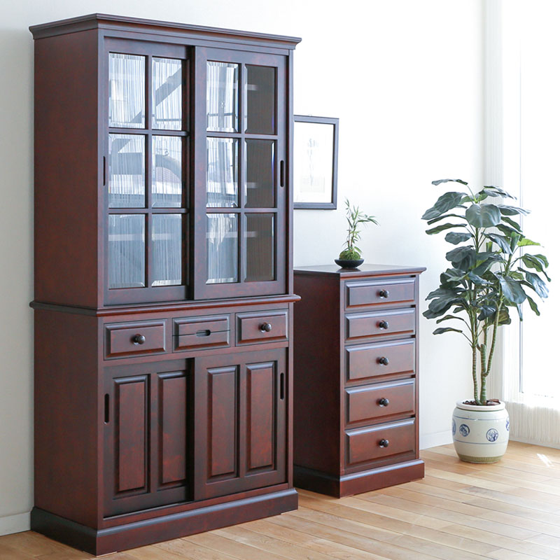 カバ材使用の90cm幅高級食器戸棚 こだわりの北海シリーズ
