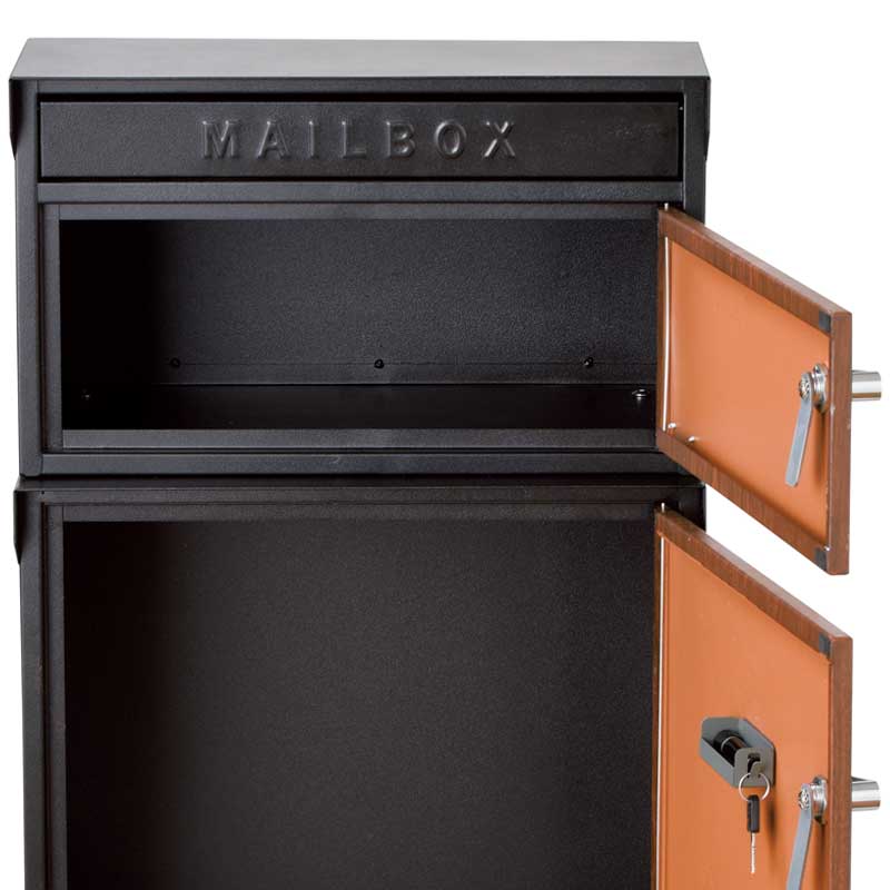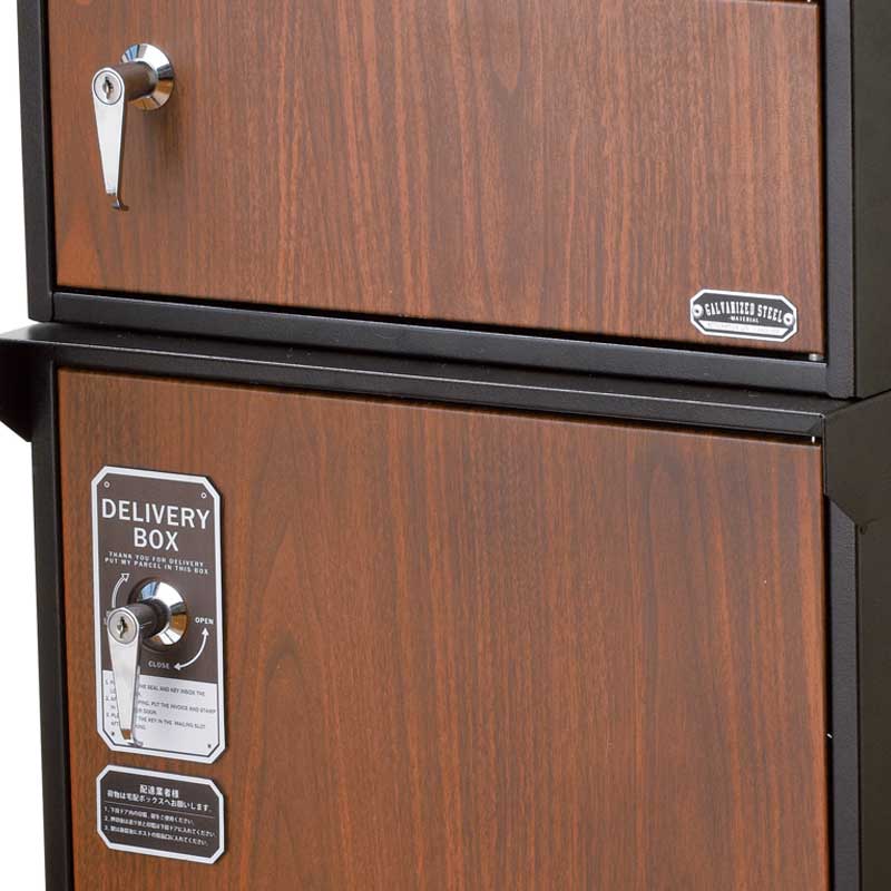 ガルバリウム鋼材仕様の木目調の前扉で素敵な宅配ボックス付きポスト ブラック&ウォールナット