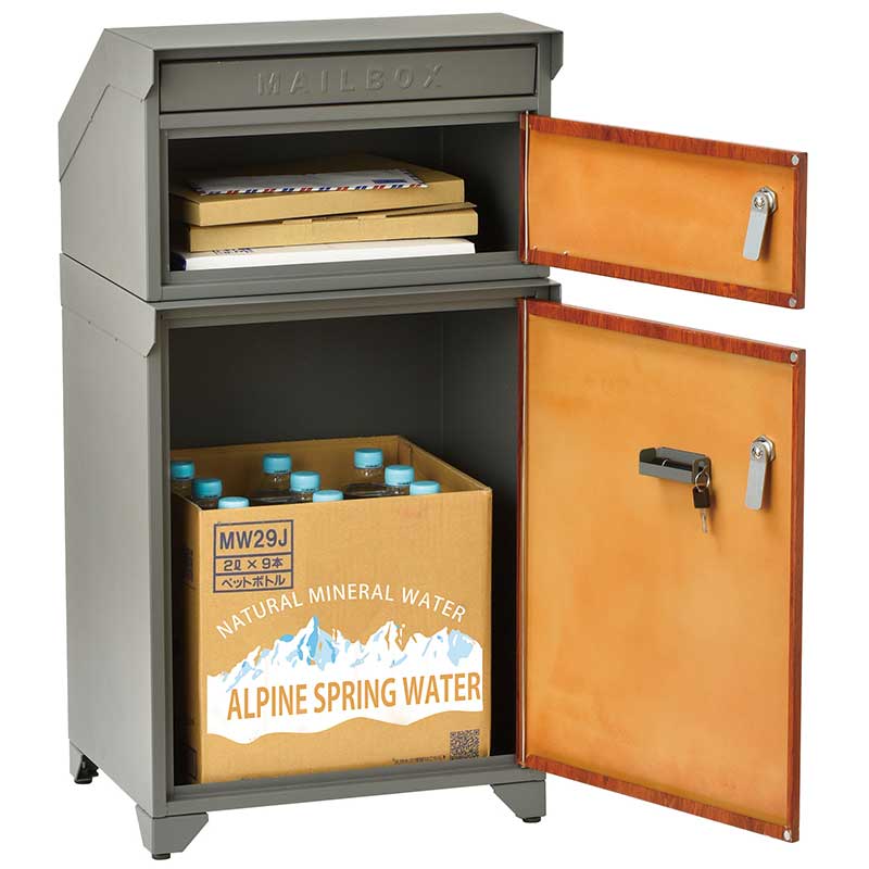 (北海道、沖縄、離島等一部地域を除く) ガルバリウム鋼材仕様のウォールナットの木目を生かした前扉が素敵な宅配ボックス付き郵便ポストです。