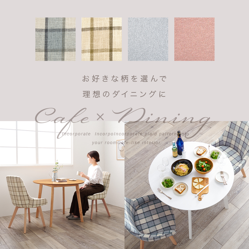円形テーブルとチェアを組み合わせたダイニング3点セット。スッキリとした無地と個性的なチェック柄が選べ、理想の空間を演出します。