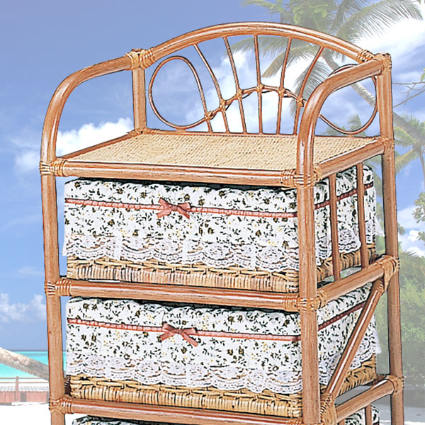引出内部にかわいらしい柄の布張りされた籐3段ランドリー(キャスター付き)。衣類からおもちゃまで収納できます。