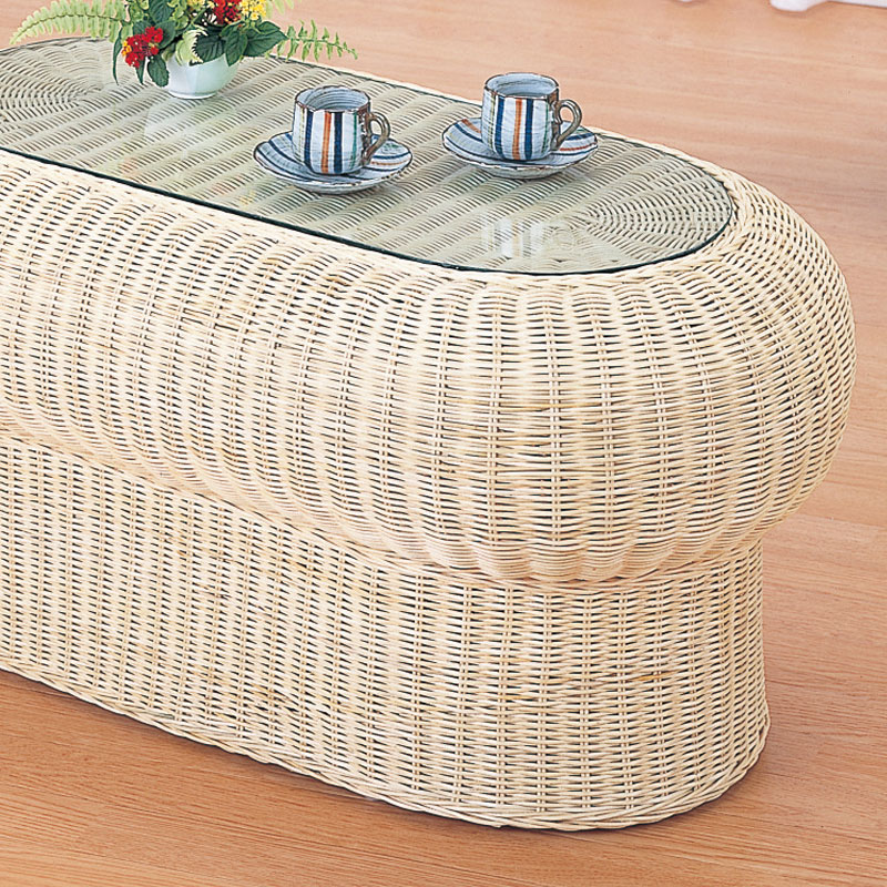天然ナチュラル色の素材感・清涼感と美しく洗練されたデザインのラタン(籐)製ソファーテーブルです。籐の芯を1本ずつ編み込んで(ウィッカー編み)作られたテーブルです。