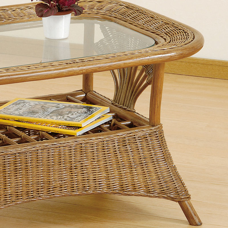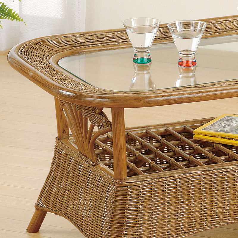90cm幅の格子の棚と脚の形がおしゃれな籐製ソファーテーブル ラタン・籐家具