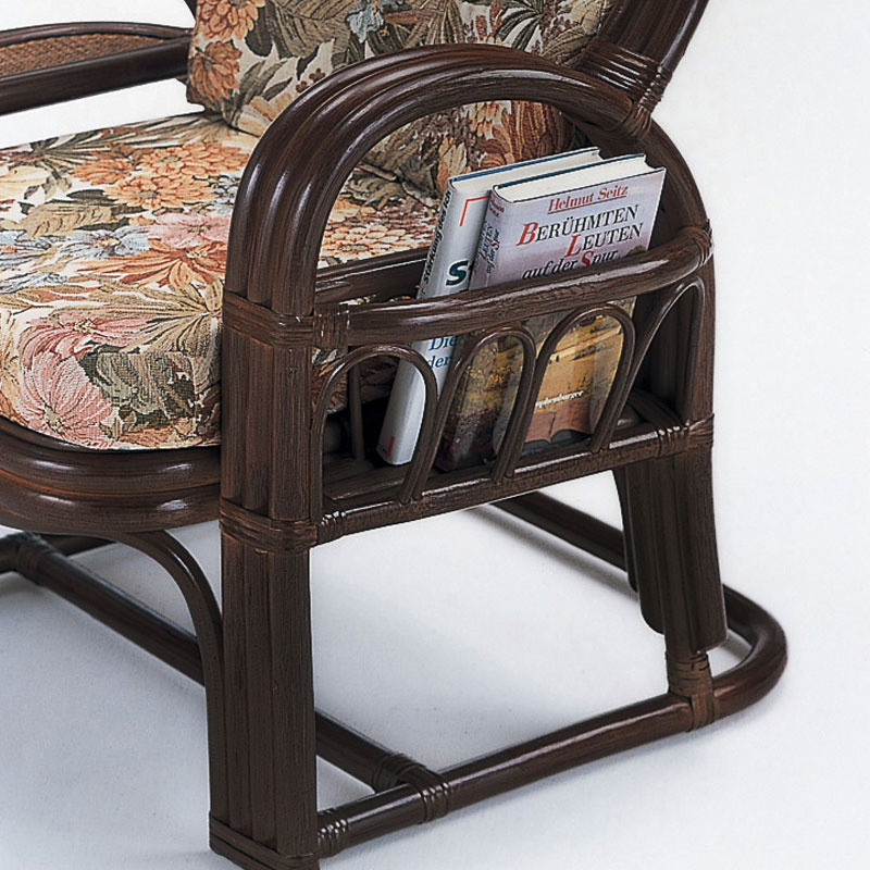 サイドテーブルとマガジンラックが付いた便利なラタンアームチェアです。