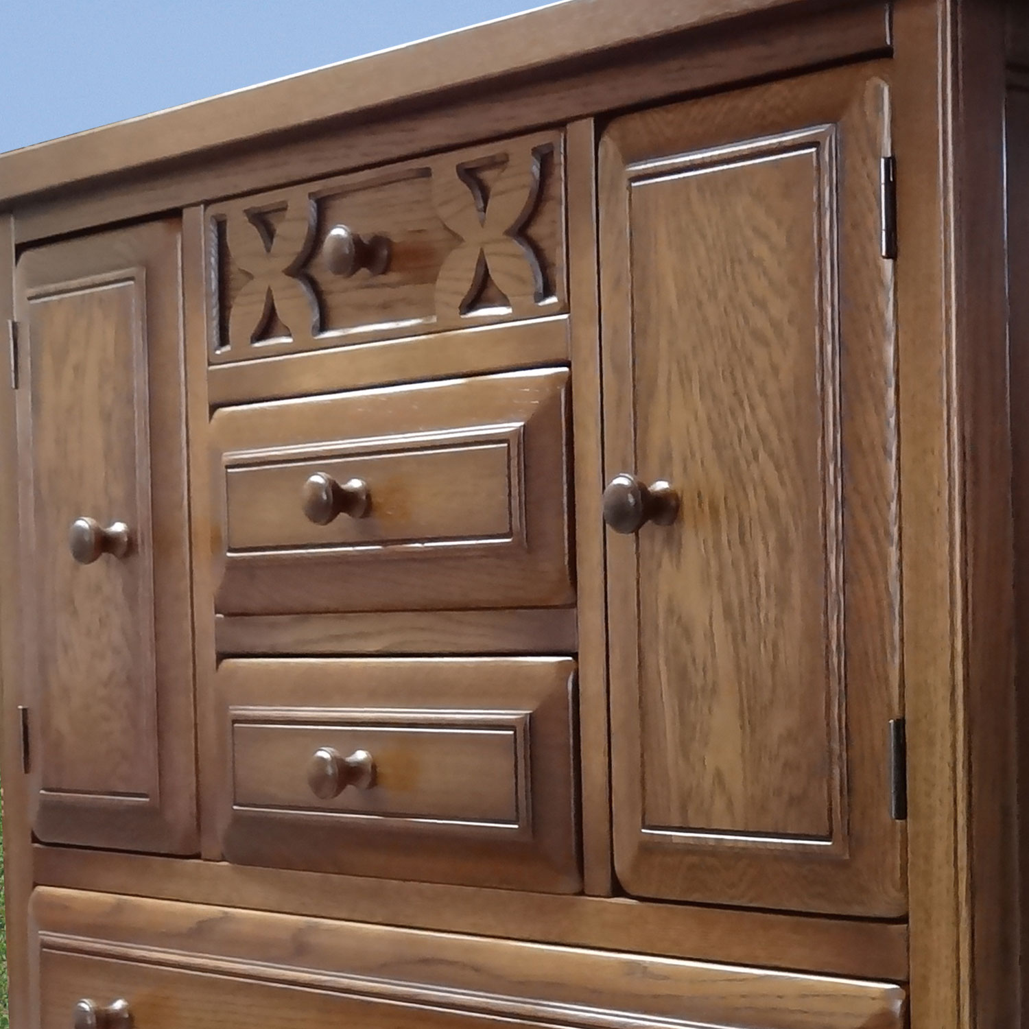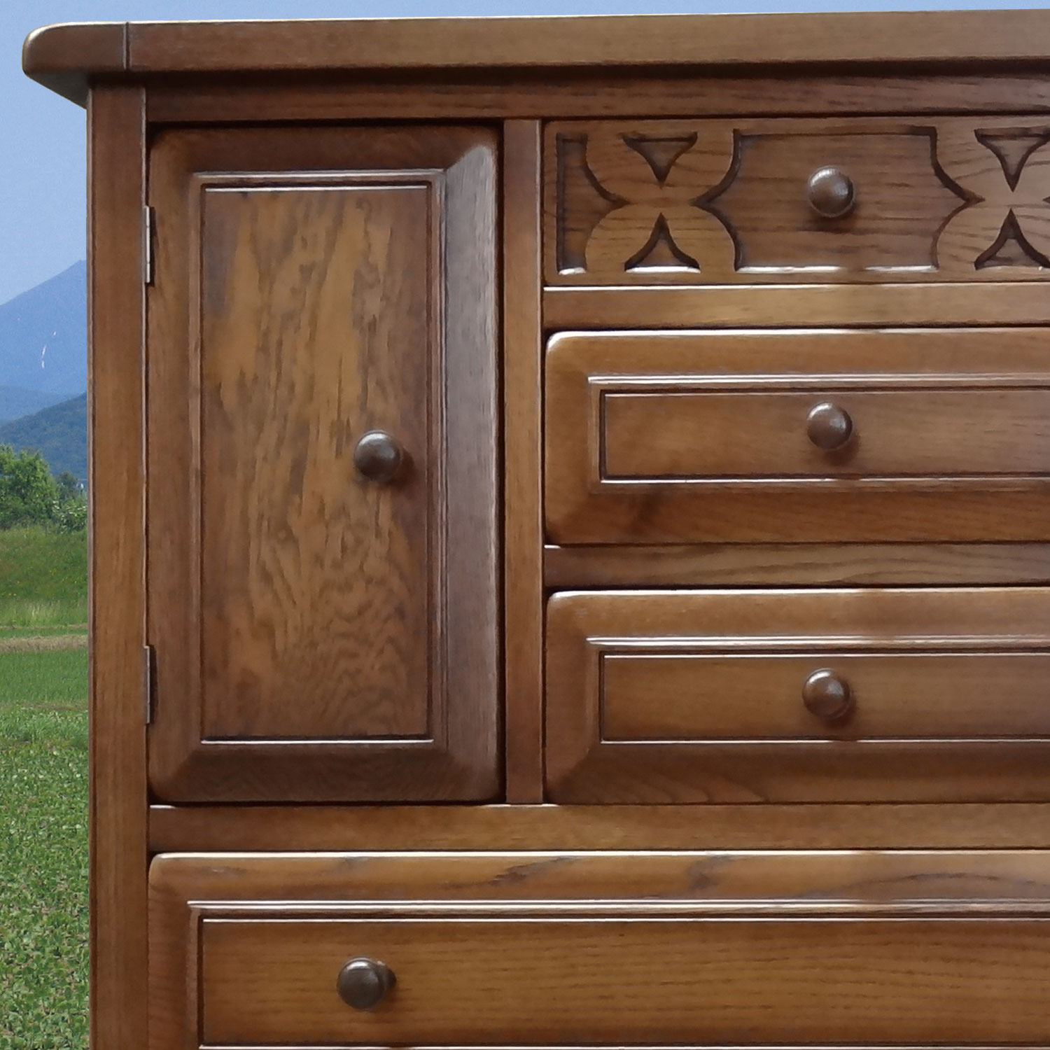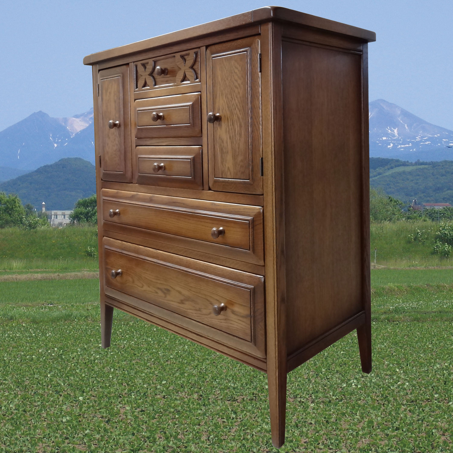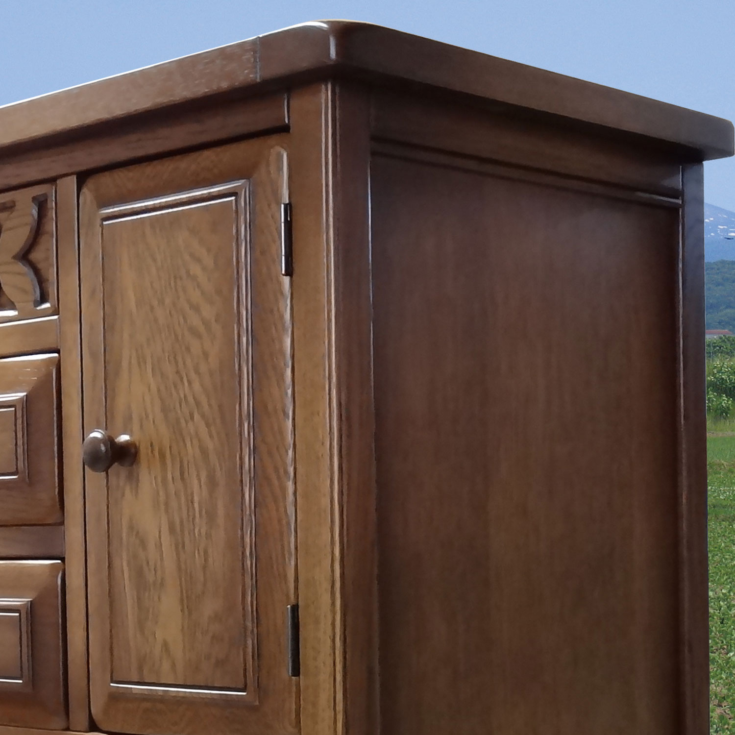 熟練の職人により、一つ一つ真心込めて作られたこのシリーズ家具は、この風合いと木の温もりを感じる家具です。昔ながらの、アンティーク家具に使われるラッカー塗装により、ワイピンングと塗装を繰り返すことで、より色の深みを出しています。これは、とても手間のかかる塗装方法ですが、一生使い続ける家具として、いっさい手抜きをしません。 また、家具の角に無垢材だからできる、かるい名栗(なぐり)加工を施し味わい深い仕上がりとなっております。 アンティーク調に仕上げたこの重厚さは、大人の風合いを漂わせます。北海道の家具とヨーロッパ家具の融合