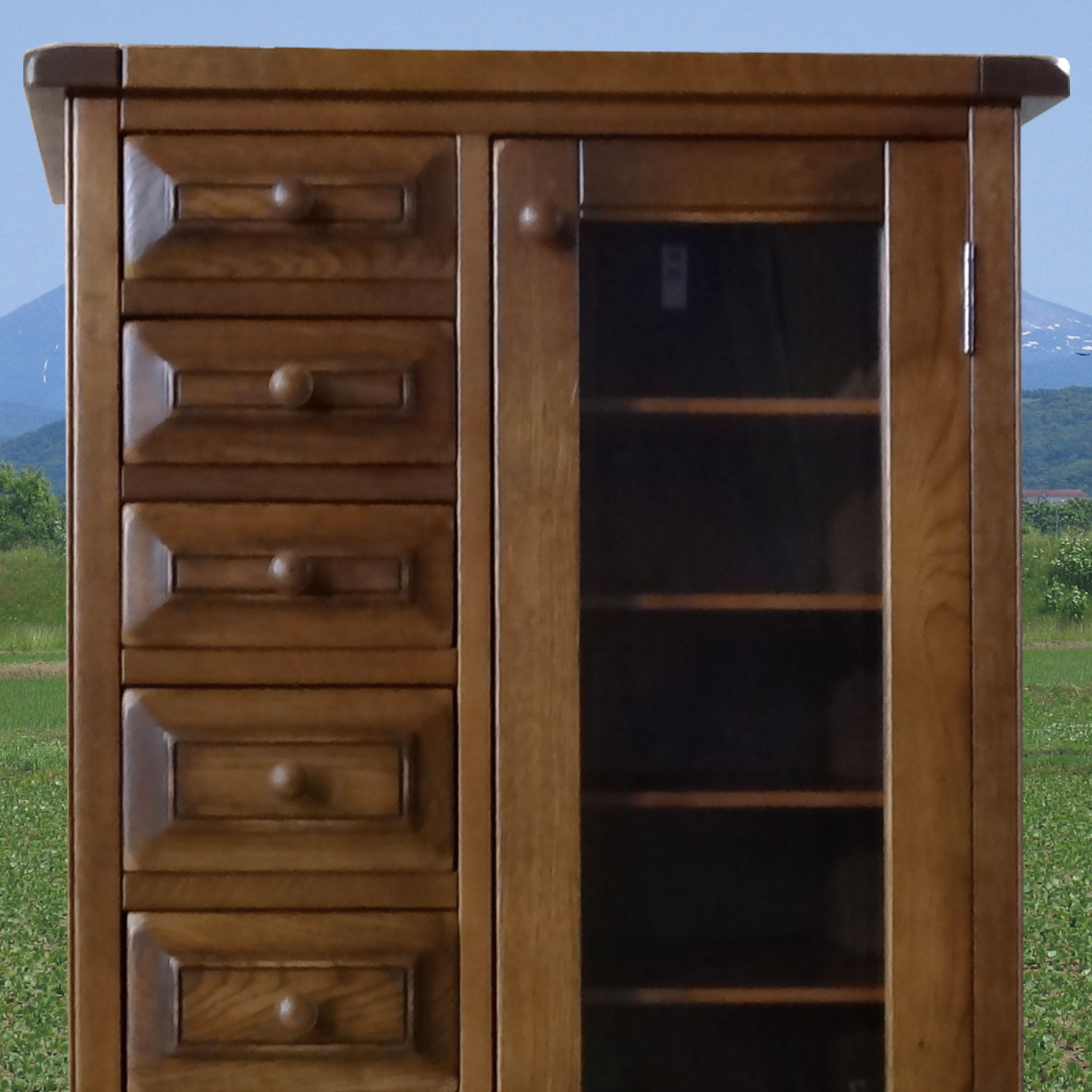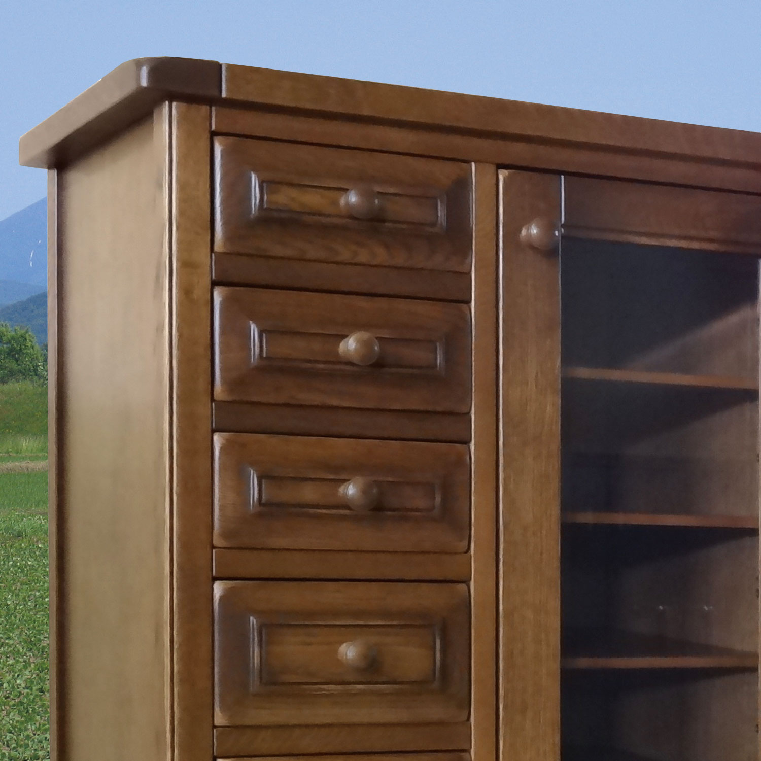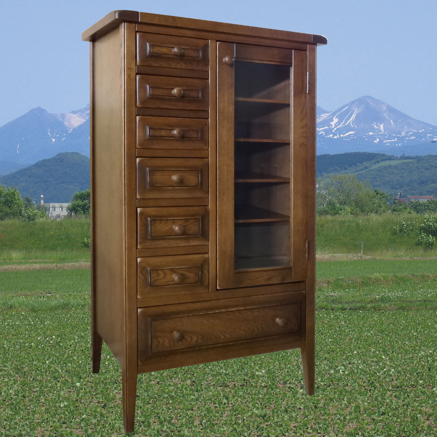 熟練の職人により、一つ一つ真心込めて作られたこのシリーズ家具は、この風合いと木の温もりを感じる家具です。昔ながらの、アンティーク家具に使われるラッカー塗装により、ワイピンングと塗装を繰り返すことで、より色の深みを出しています。これは、とても手間のかかる塗装方法ですが、一生使い続ける家具として、いっさい手抜きをしません。 また、家具の角に無垢材だからできる、かるい名栗(なぐり)加工を施し味わい深い仕上がりとなっております。 アンティーク調に仕上げたこの重厚さは、大人の風合いを漂わせます。北海道の家具とヨーロッパ家具の融合