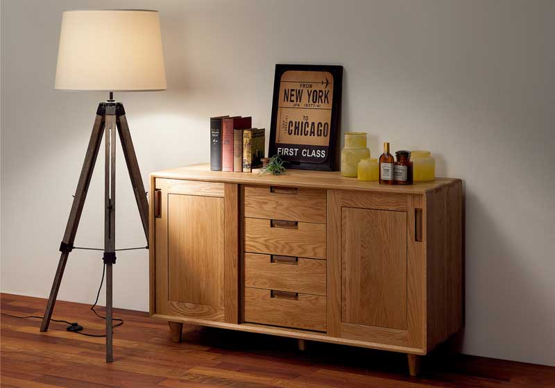 国内デザイナーがデザインしたオーク無垢材をふんだんに使ったとても素敵な120cm幅サイドボードです。機能性も充実した逸品です。
