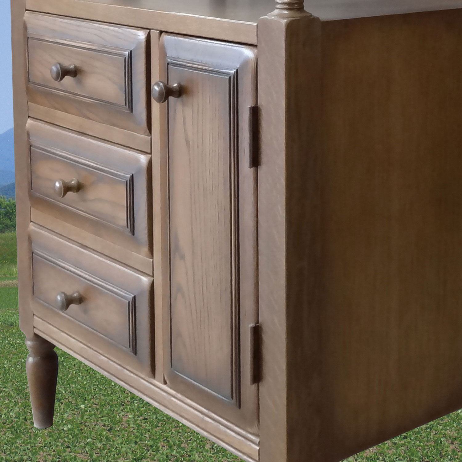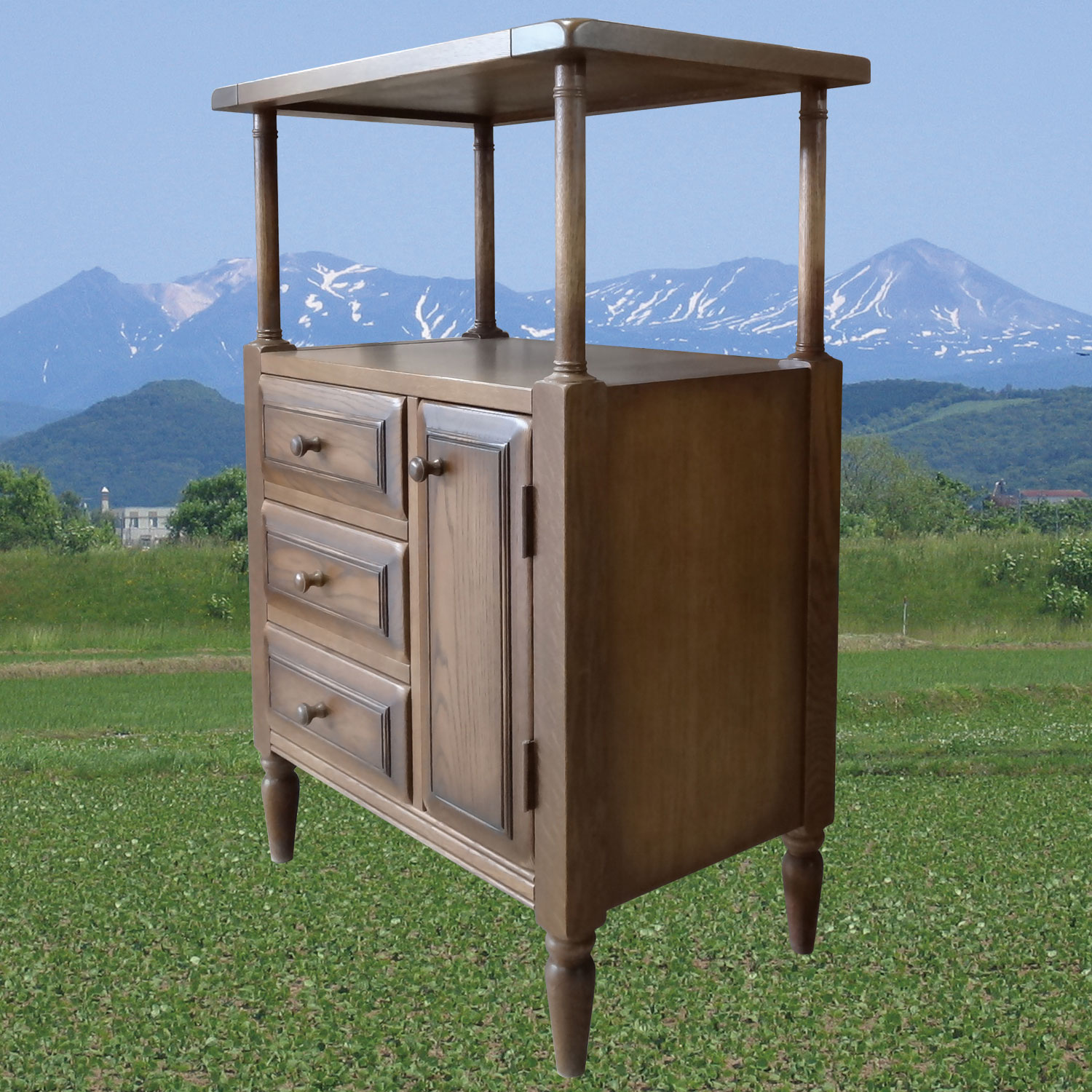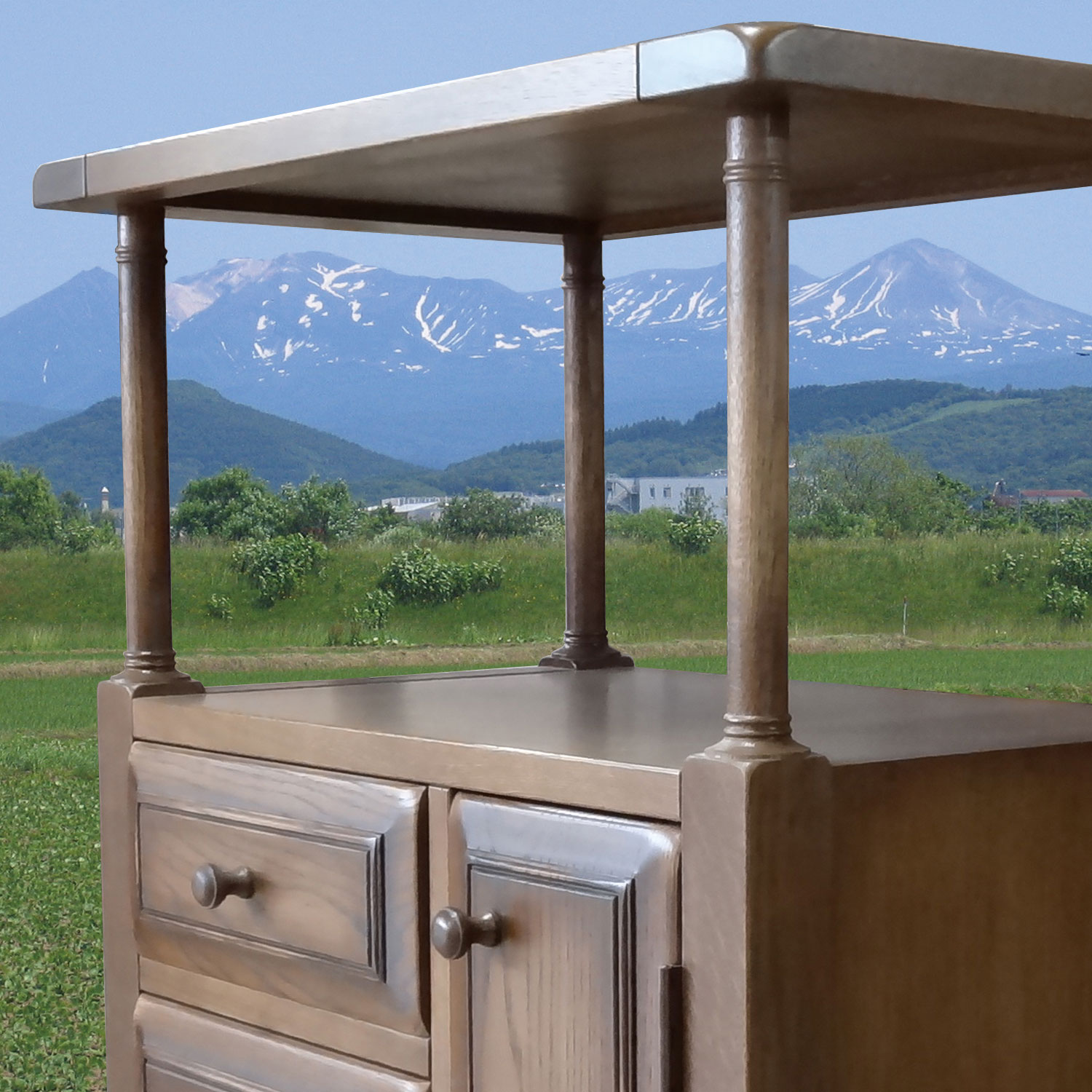 熟練の職人により、一つ一つ真心込めて作られたこのシリーズ家具は、この風合いと木の温もりを感じる家具です。昔ながらの、アンティーク家具に使われるラッカー塗装により、ワイピンングと塗装を繰り返すことで、より色の深みを出しています。これは、とても手間のかかる塗装方法ですが、一生使い続ける家具として、いっさい手抜きをしません。 また、家具の角に無垢材だからできる、かるい名栗(なぐり)加工を施し味わい深い仕上がりとなっております。 アンティーク調に仕上げたこの重厚さは、大人の風合いを漂わせます。北海道の家具とヨーロッパ家具の融合