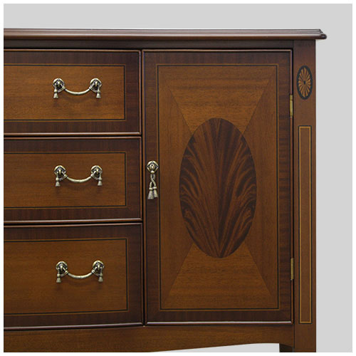 熟練の職人の手作業により、厚さ0.55ほどの単板(木をスライスしたもの)を模様に合わせて切り取り、表面を「焼き砂」焦がして影の表情を付け、丹念に貼り合わせて形にします。その飾りの本体の表面に埋め込んで、優美な模様に仕上げる細工でヨーロッパ家具の伝統ある技法を用いています。2.異種木目による模様貼り