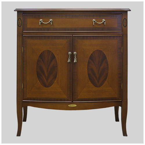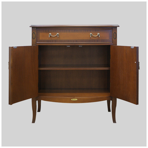 熟練の職人の手作業により、厚さ0.55ほどの単板(木をスライスしたもの)を模様に合わせて切り取り、表面を「焼き砂」焦がして影の表情を付け、丹念に貼り合わせて形にします。その飾りの本体の表面に埋め込んで、優美な模様に仕上げる細工でヨーロッパ家具の伝統ある技法を用いています。2.異種木目による模様貼り
