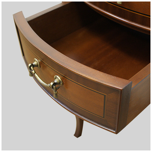 コンパクトなシリーズですが、各アイテムの裏面と引出しの中まで塗装を施し、清潔感と高級感を高めます。9.タッセル模様の引手