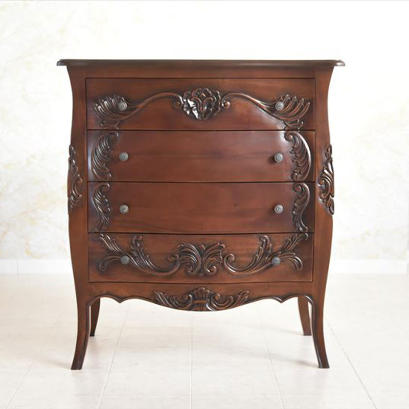 手彫りの彫刻とエレガントな猫脚が魅力の4段チェストです。