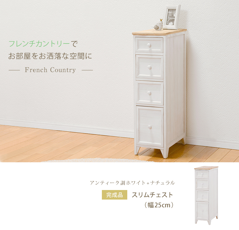 (北海道、沖縄、離島等一部地域除く)(※北海道・沖縄・離島は別途送料お見積します。ご注文前にお問い合わせ下さい。)隙間にぴったり。シャビーホワイトの本体にアンティーク調ナチュラルな天板が映える、25cm幅のシンプルスリムチェスト。