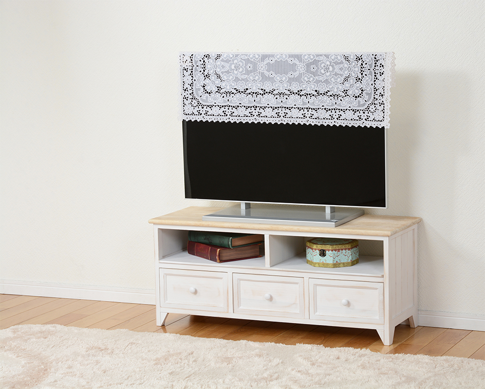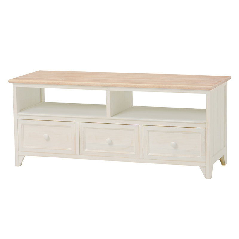 シャビーホワイトの本体にアンティーク調ナチュラルな天板が映える、94cm幅シンプルテレビ台