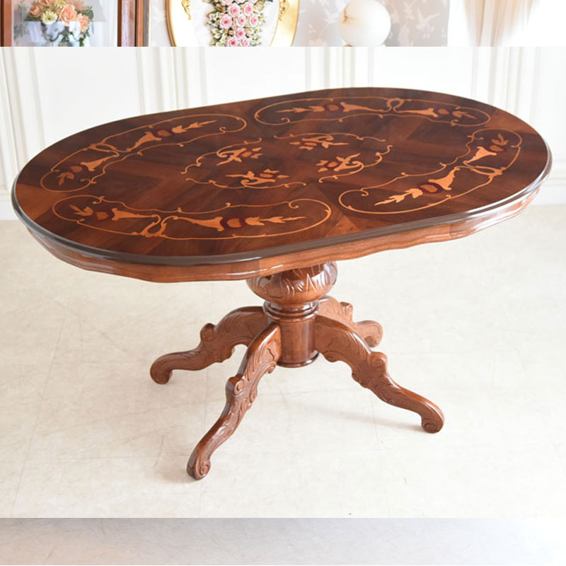 (北海道、沖縄、離島等一部地域を除く) ルネッサンスイタリアコレクションの象嵌入りの本革張りダイニング5点セット。シックで重厚感抜群の象嵌加工を施したイタリア製4人用テーブルセット。ダイニングチェアの張地は、本革のイタリアンブルー色。圧迫感が無い、オシャレな楕円形です。キラキラした鏡面塗装が綺麗ですね。本革使用で、汚れにも強いダイニングチェアです。