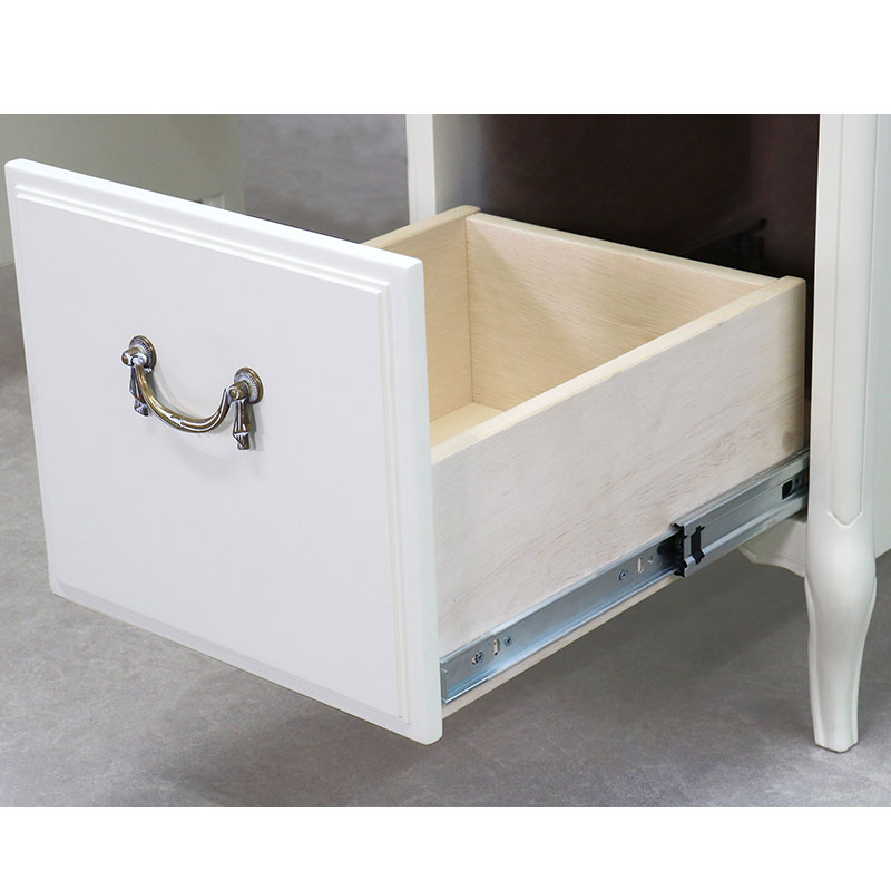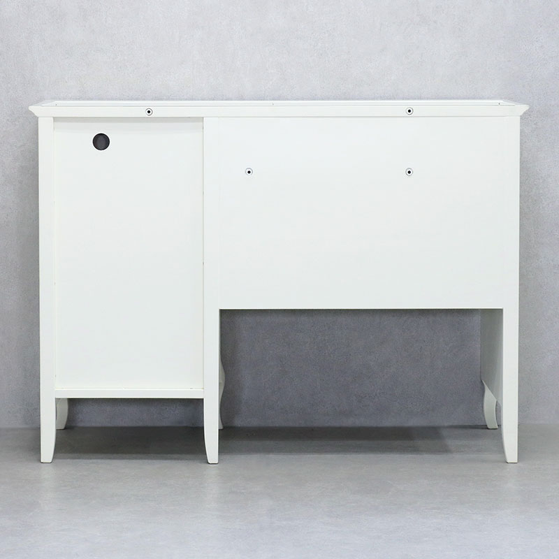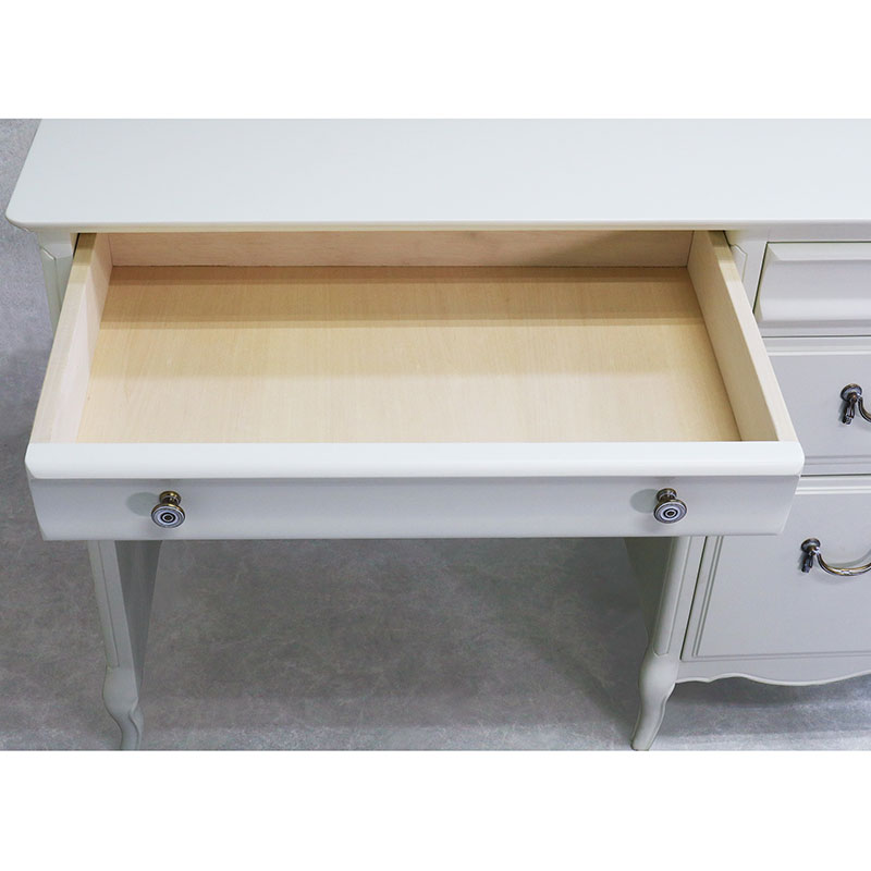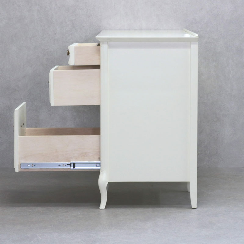 ミラーナWシリーズは、上品さとナチュラルさを併せ持ち、緩やかな曲線を巧みに活かした引き出しの前面と宮廷装飾を思わせるシャビ―塗装を施した大き目の把手が印象的な家具シリーズです。