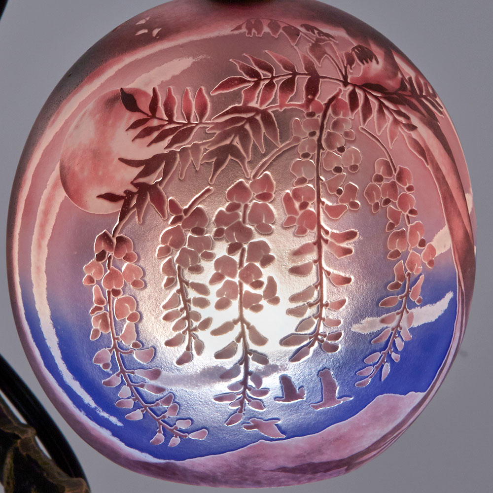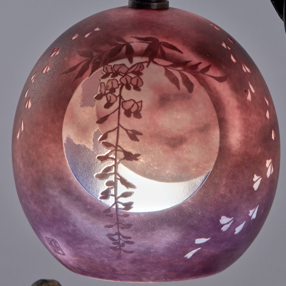 藤をモチーフにした風景が素敵な宙吹きガラスのシェードを使ったミニランプです。ガラス工芸作家、高城健治・高城美和子の芸術的な作品です。