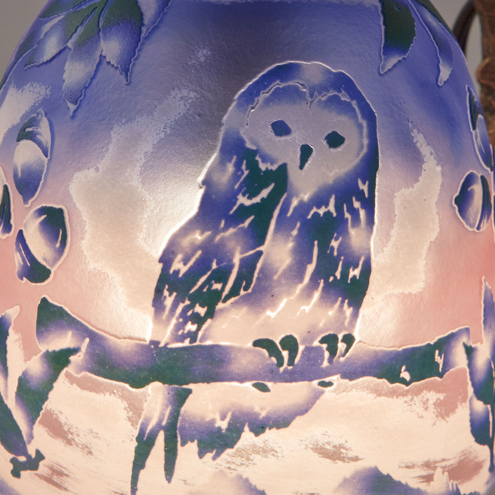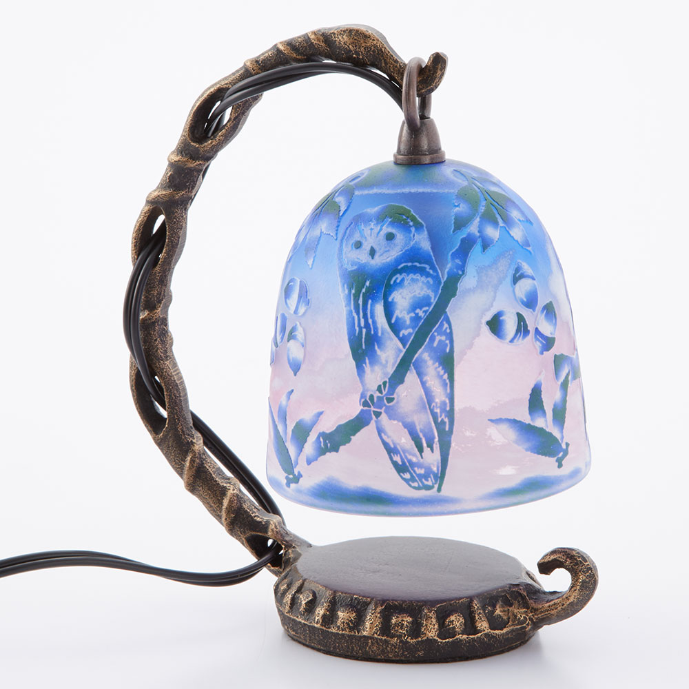 かわいらしいふくろうをモチーフにして制作された宙吹きガラスのシェードを使ったミニランプです。ガラス工芸作家、高城健治・高城美和子の芸術的な作品です。