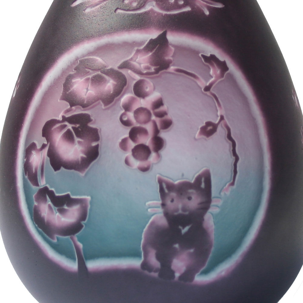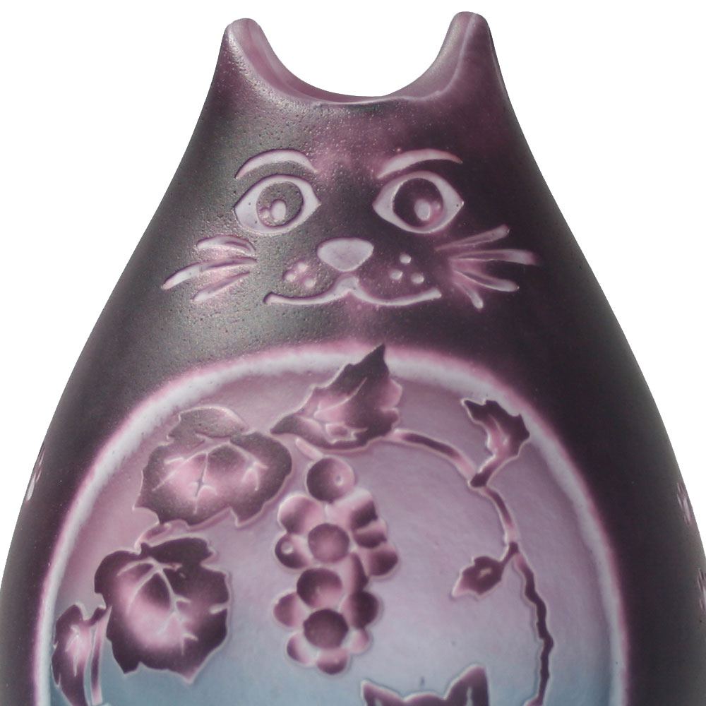 ねこをモチーフにして制作された宙吹きガラスのねこ型ミニランプです。色をパープルに仕上げました。ガラス工芸作家、高城健治・高城美和子の芸術的な作品です。
