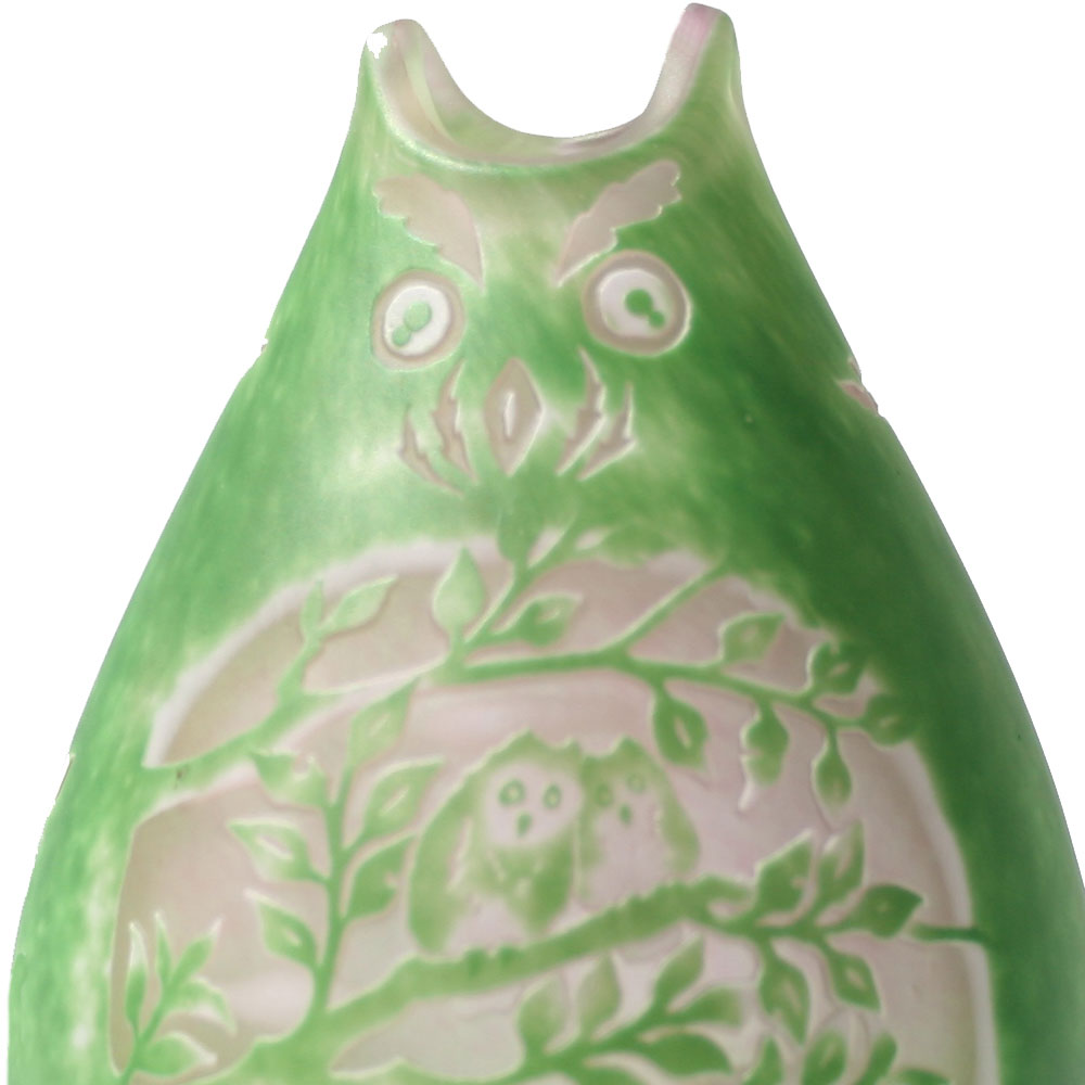 ふくろうをモチーフにして制作された宙吹きガラスのふくろう型ミニランプです。色をグリーンに仕上げました。ガラス工芸作家、高城健治・高城美和子の芸術的な作品です。