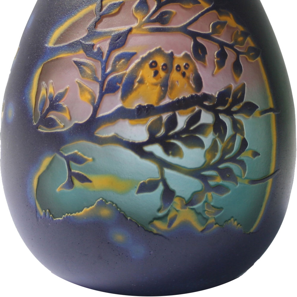 ガラスを宙吹きする工程の前には、ガラスをパウダー状に細かくし、下玉に被せてデザインの奥行きを出し、複雑な色と立体的で遠近感のあるモチーフ表現で、やさしい雰囲気の作品が出来上がっていきます。