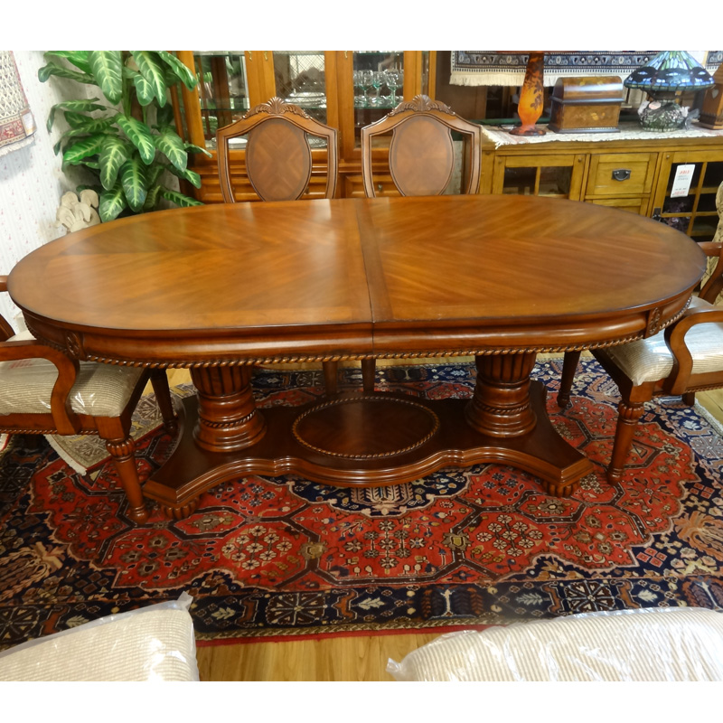 アメリカメーカー製ダイニングセット。クラシックなデザインで、テーブルは伸張式。お客様をおもてなしする時にもとても便利。豊かな暮らしを演出してくれます。