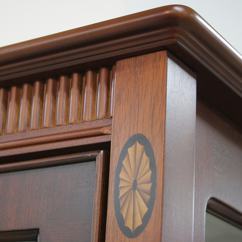 熟練の職人の手作業により、厚さ0.55ほどの単板(木をスライスしたもの)を模様に合わせて切り取り、表面を「焼き砂」焦がして影の表情を付け、丹念に貼り合わせて形にします。その飾りの本体の表面に埋め込んで、優美な模様に仕上げる細工でヨーロッパ家具の伝統ある技法を用いています。2.異種木目による模様貼り