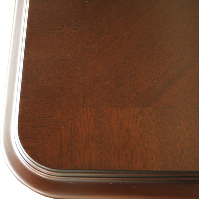 ソファー・ダイニングチェアの脚やキャビネットの扉の表面などには彫刻で仕上げたリブ(浮き上がる彫刻)が施されています。あくまでもシンプルに、大げさにならないようにしたこの木製の模様はさりげないデザインポイントとなっています。また、天板の中心を囲むように施された突き板の化粧張りが優美さを表現しています。また、ガラスキャビネットに使われている木格子はチッペンデール様式の頃の中国建築に影響を受けた形が取り入れられています。