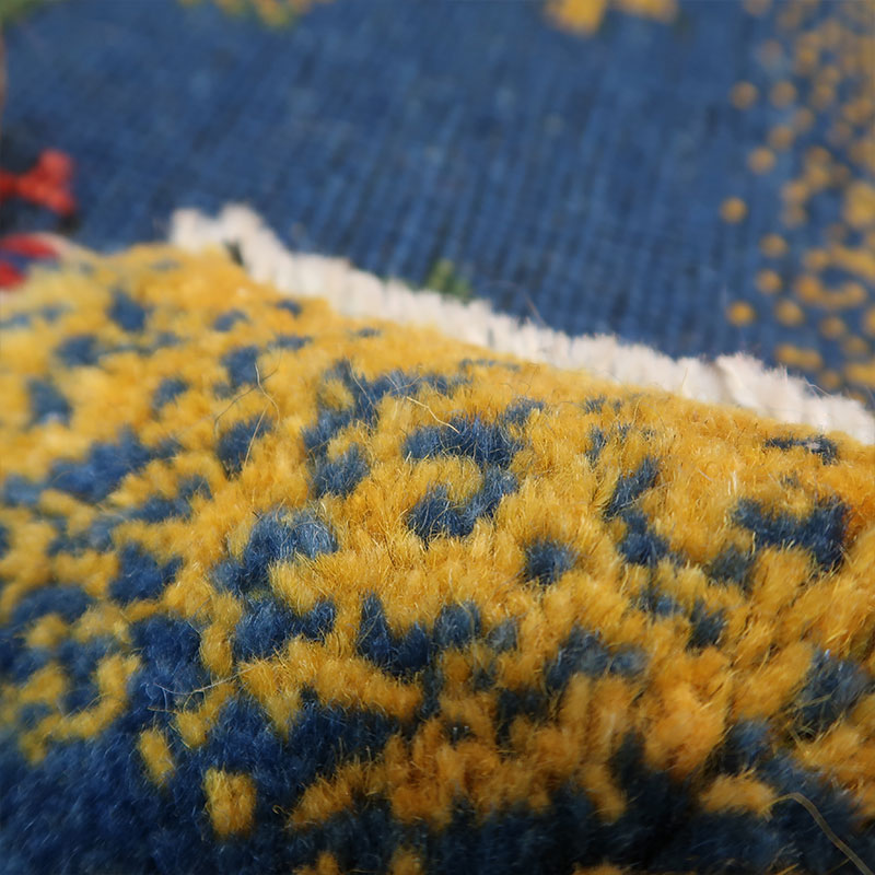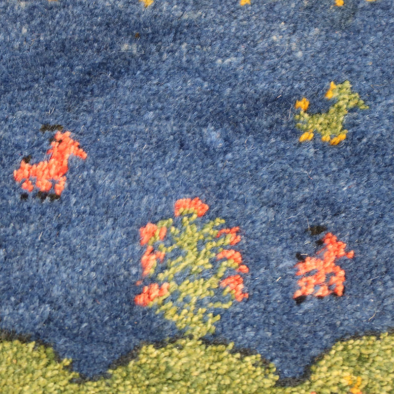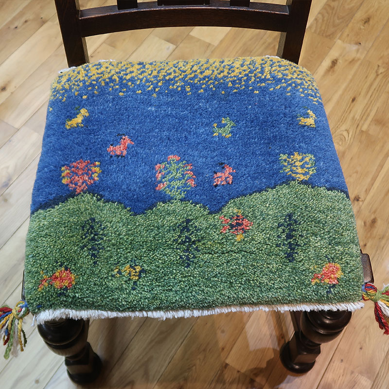 ペルシャ絨毯の中でも毛足が長いギャッベ(ギャベ)AB-AJ12331。こちらのサイズは、ミニ座布団サイズで、ダイニングチェアや車のシートの上に敷いてお使いいただけるふかふかのギャッベ絨毯です。