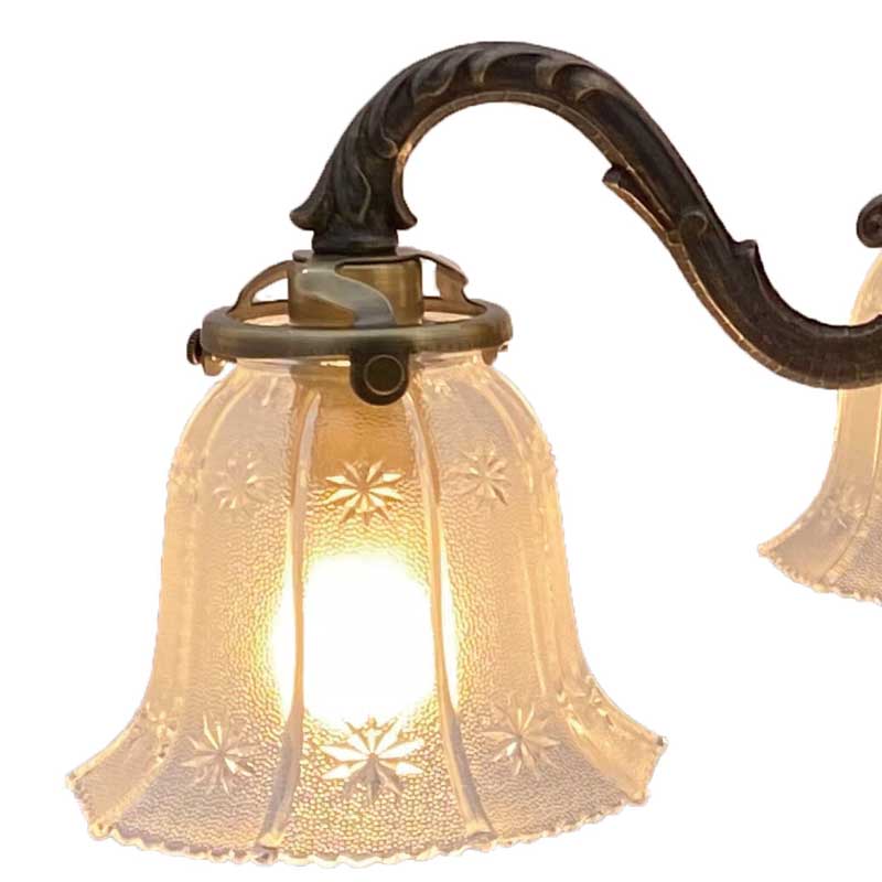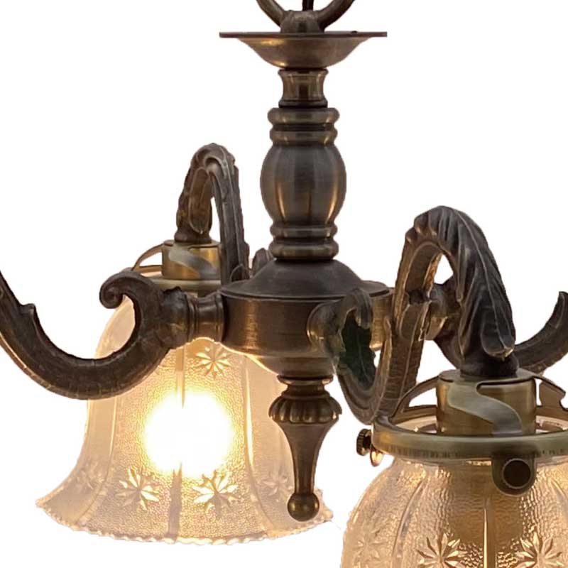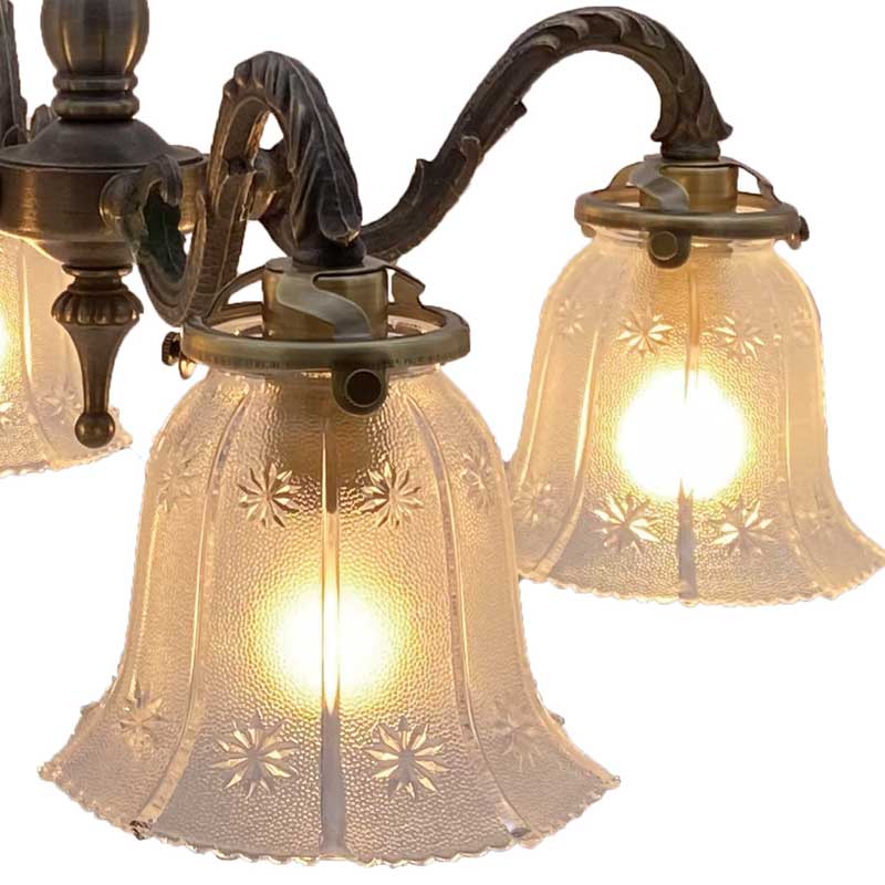 おしゃれなガラスシェードが付いた4灯シャンデリア照明。各パーツを海外にて生産し国内にて、組み立て配線しています。