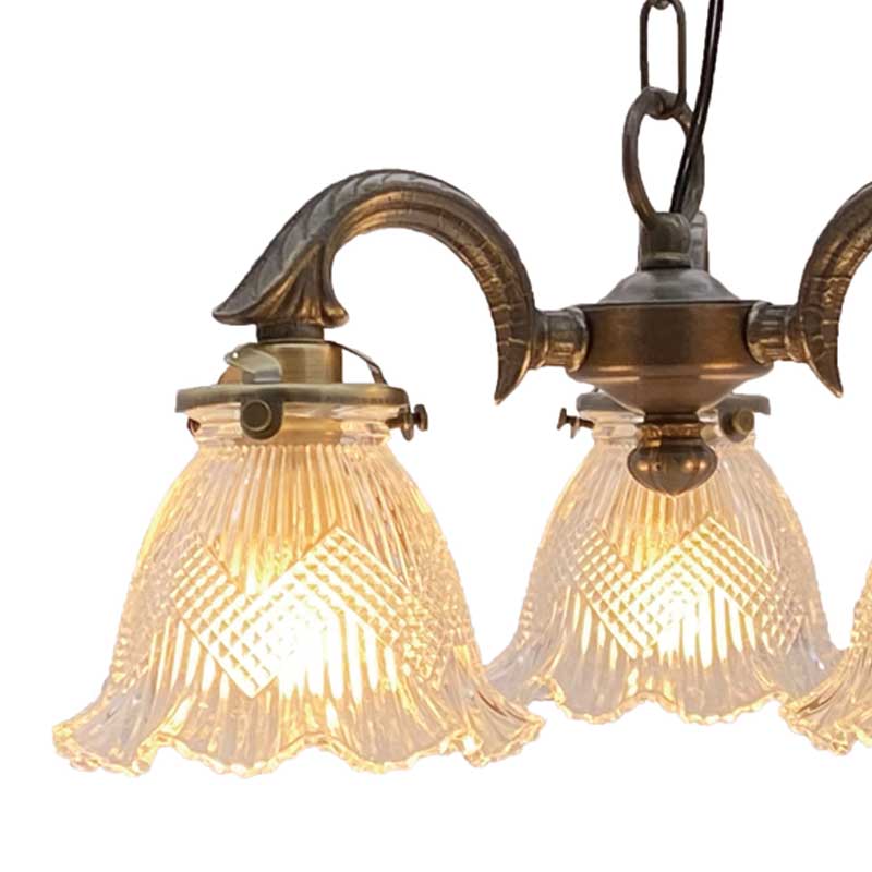 豪華なフレームにフリルが付いたようなデザインのガラスシェードが付い3灯シャンデリア照明各パーツを海外にて生産し国内にて、組み立て配線しています。