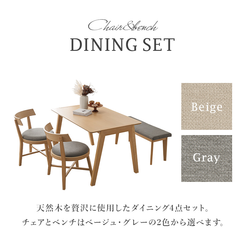 天然木を贅沢に使用したダイニング4点セット。チェアの丸みを帯びた愛らしいシルエットが空間を柔らかに演出します。