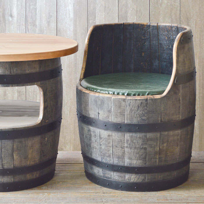 長い熟成の旅を終えた樽が高級家具材として生まれ変わり、そのウイスキー樽材(オーク材)を使用し味わい深いバレルウッドチェアーが出来上がりました。
