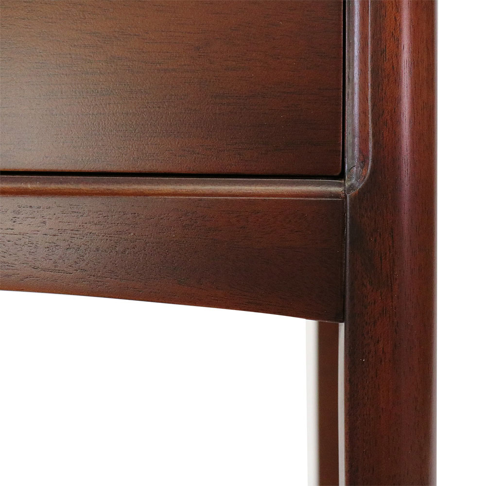マホガニー材にヴィンテージ感のあるミディアムブラウンのセミマッド塗装を施し、北欧テイストを感じさせ、ブルックリンスタイルにも合わせやすいデザインにしています。