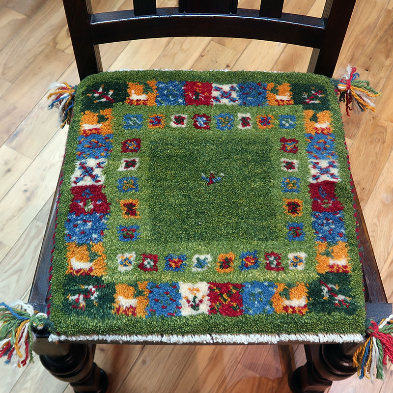 こちらのサイズは、ミニ座布団サイズで、ダイニングチェアや車のシートの上に敷いてお使いいただけるふかふかのギャッベ(ギャベ)絨毯です。