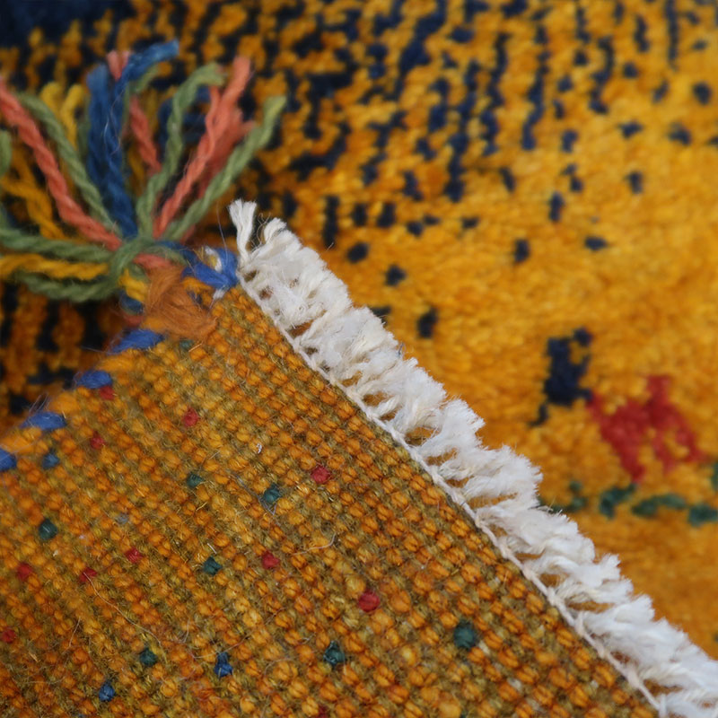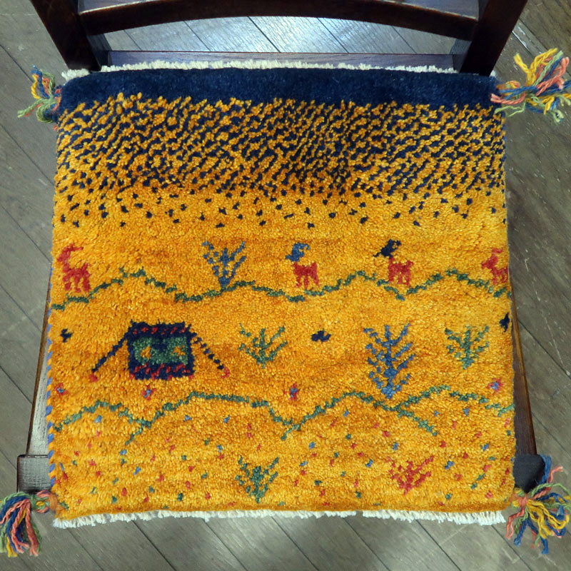 ペルシャ絨毯の中でも毛足が長いギャッベ(ギャベ)AB-AJ29351 。こちらのサイズは、ミニ座布団サイズで、ダイニングチェアや車のシートの上に敷いてお使いいただけるふかふかのギャッベ(ギャベ)絨毯です。