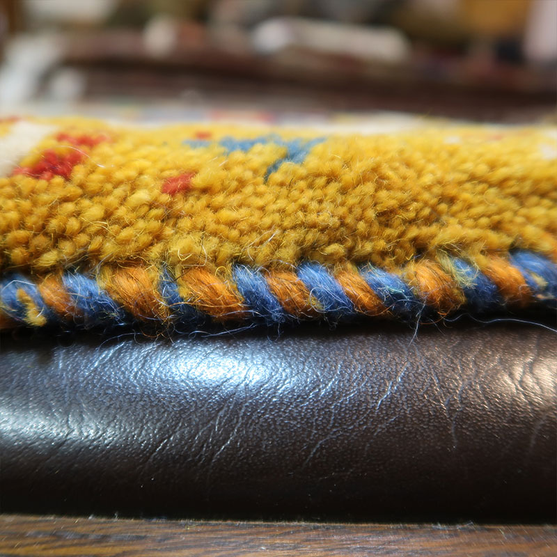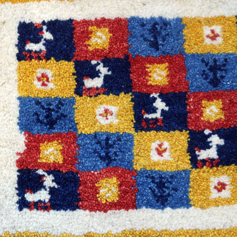 ペルシャ絨毯の中でも毛足が長いギャッベ(ギャベ)AB-T1808。こちらのサイズは、ミニ座布団サイズで、ダイニングチェアや車のシートの上に敷いてお使いいただけるふかふかのギャッベ(ギャベ)絨毯です。