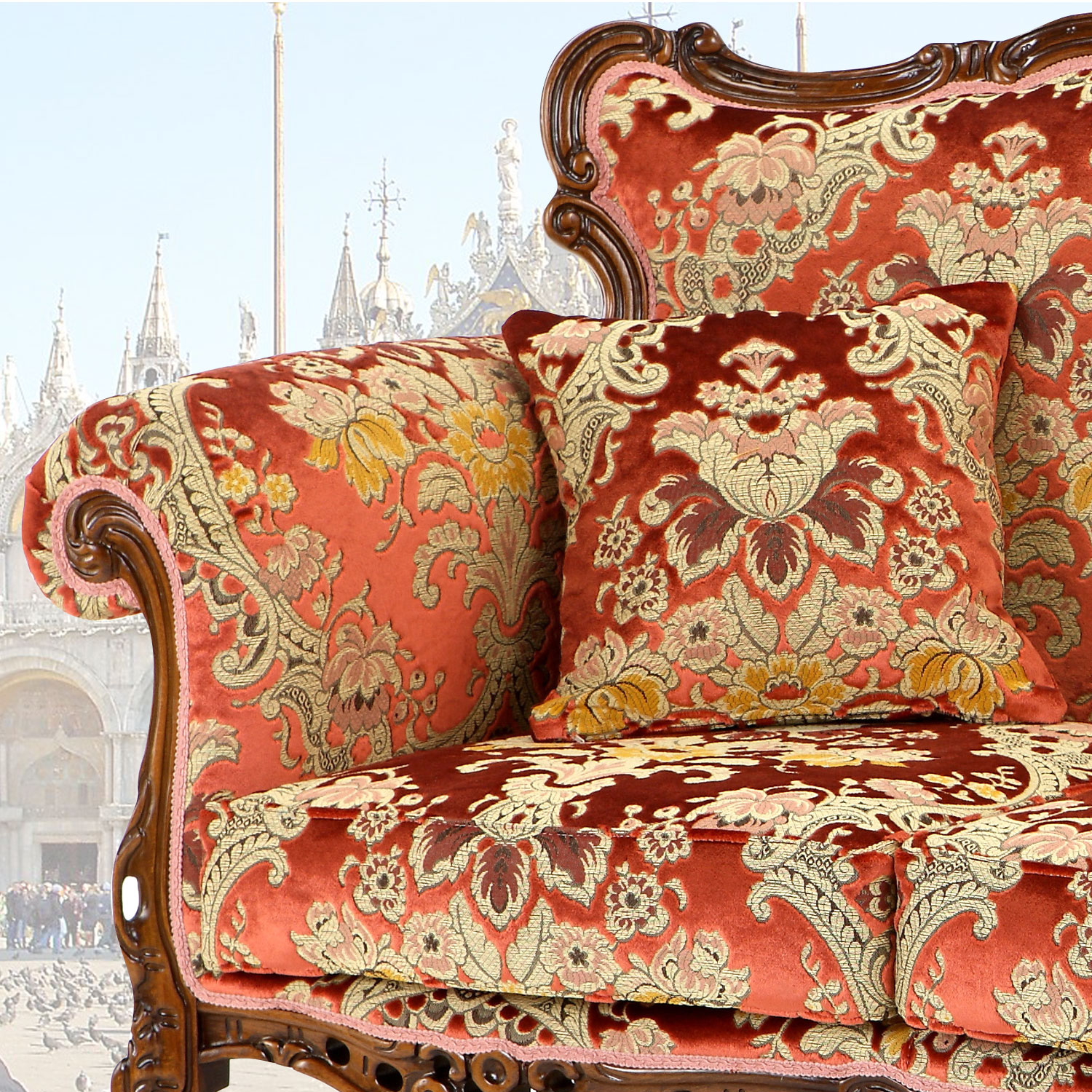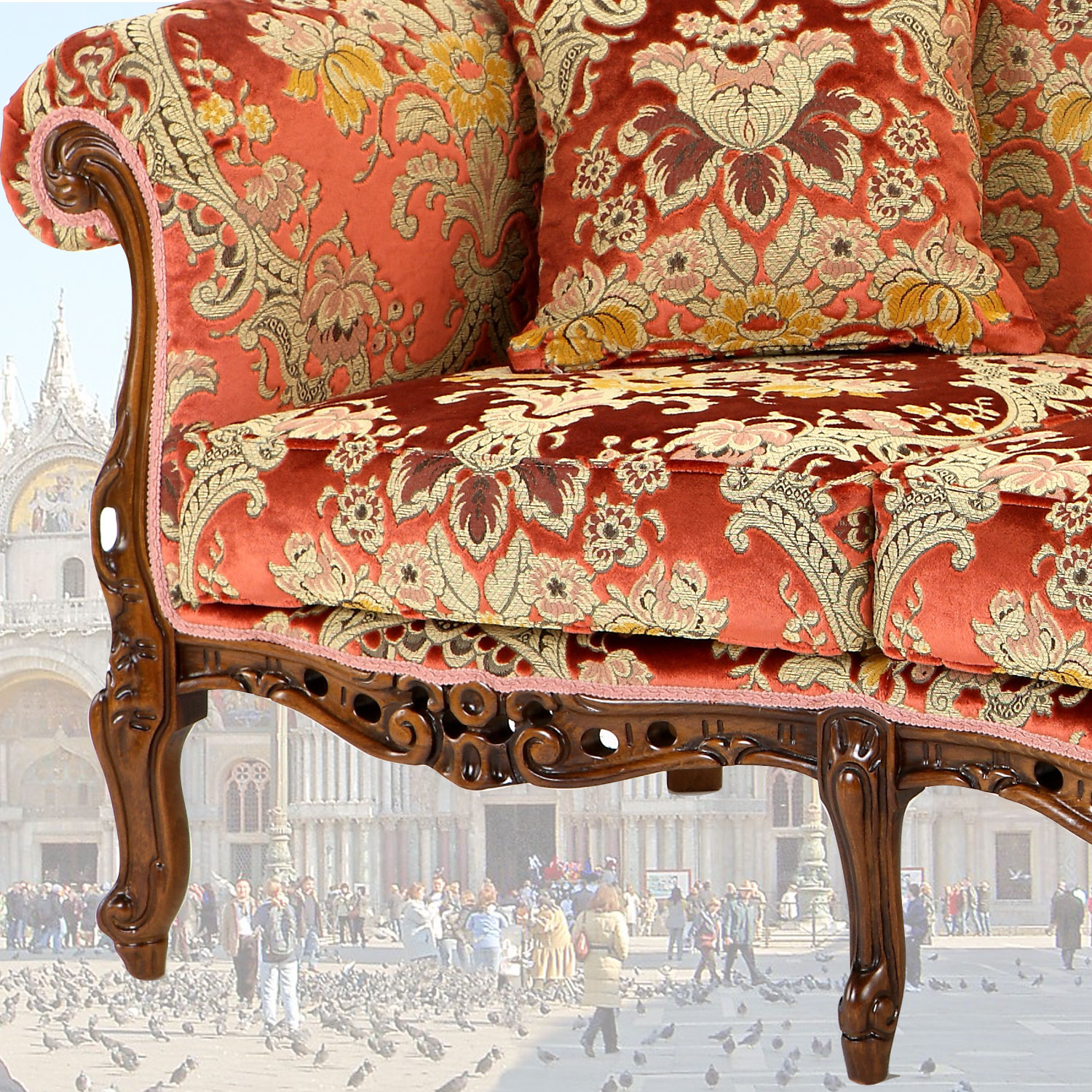 本場イタリア製、木目調ブラウンの伝統のあるイタリアクラシックデザインの三人掛けソファーです。。エレガントでスタイリッシュな彫刻と猫脚が魅力です。金華山のファブリックを使用し、お部屋を豪華な雰囲気にしてくれます。
