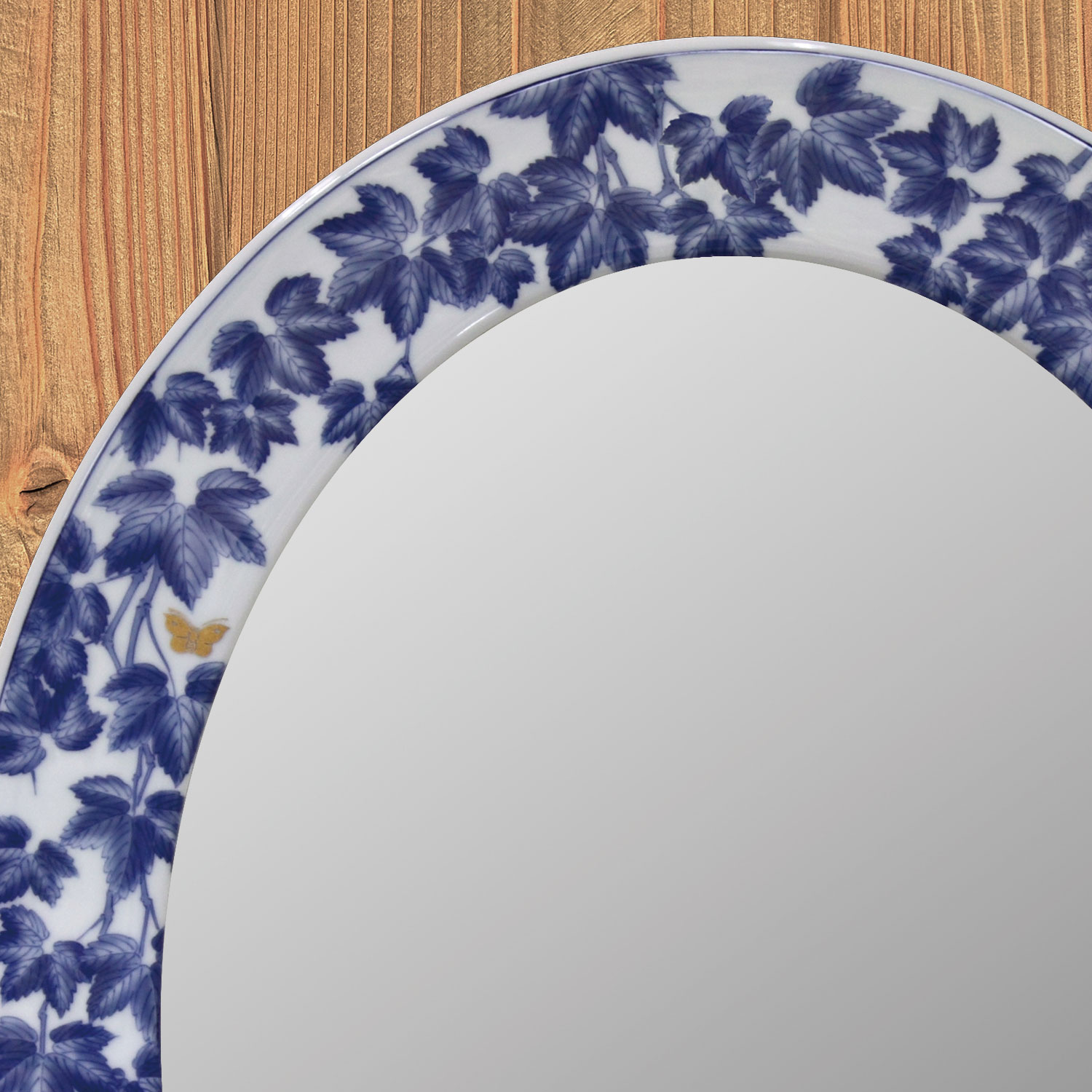 有田焼のおしゃれなデザインの染付ツタ絵壁掛けカガミです。有田デコの匠の技が光る逸品です。